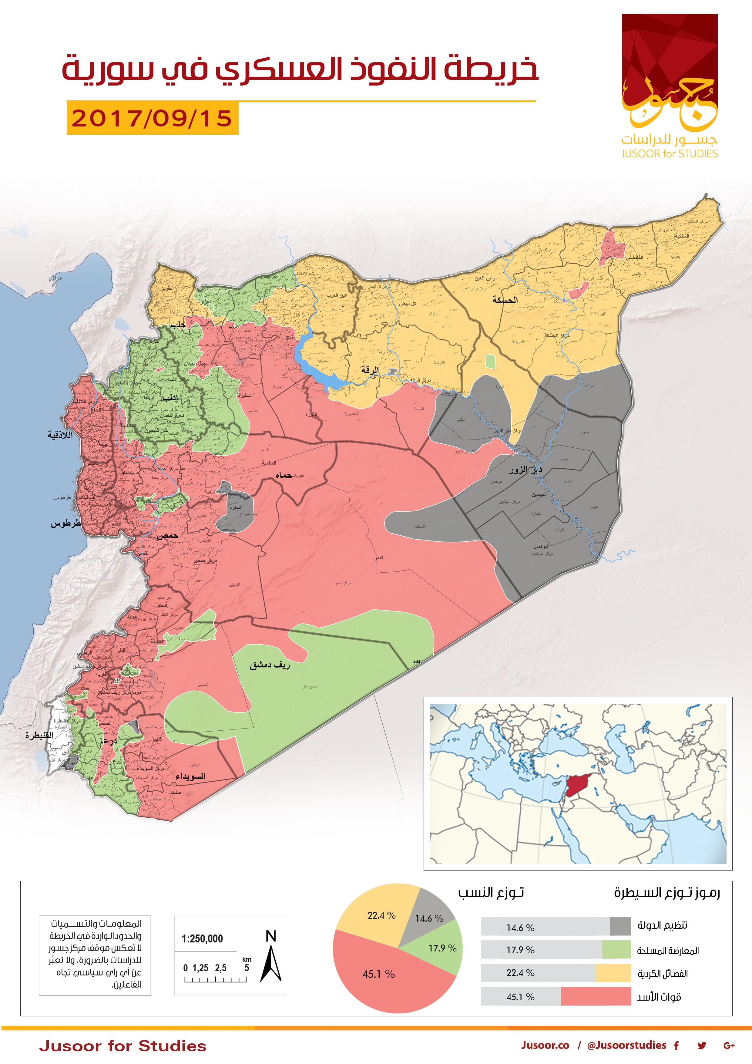أصدر مركز جسور للدراسات خارطة النفوذ العسكري في سورية عن النصف الأول من شهر أيلول/ سبتمبر 2017، على ضوء التغيرات العسكرية البارزة شرق البلاد، والتي تظهر تغيراً في نسب السيطرة الكلية بين مختلف القوى، باستثناء نسب السيطرة التابعة للمعارضة السورية والتي تضمّنها اتفاق خفض التصعيد الذي تم التوصل إليه في 4 أيار/ مايو 2017 خلال مفاوضات "أستانا-4".