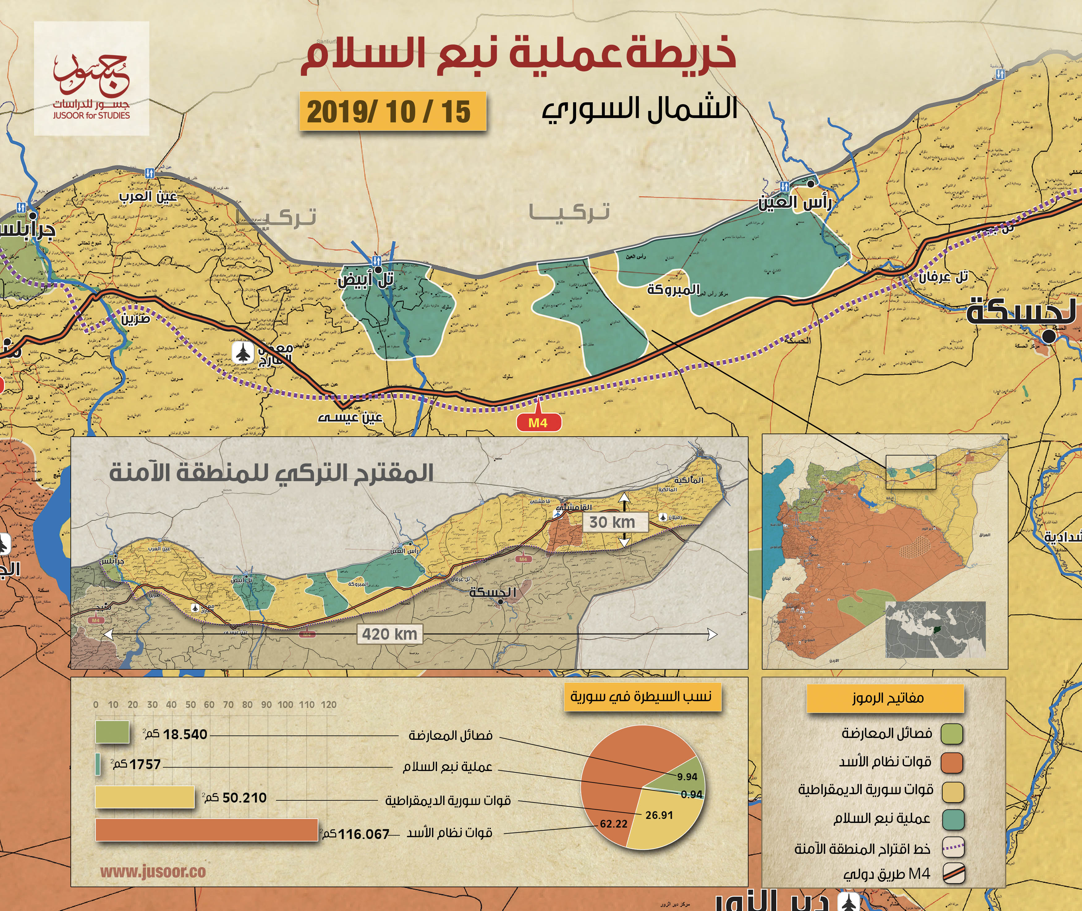 - ازدادت نسبة سيطرة فصائل المعارضة السورية بمعدّل (0.94%) والتي تم تحقيقها بعد أسبوع من انطلاق عملية نبع السلام، بمساحة تعادل 1757 كم مربع، لتضاف هذه النسبة إلى تلك التي سجلتها الشهر الماضي والمقدّرة ب (9.94%)، والمعادلة لمساحة 18540 كم مربع.
