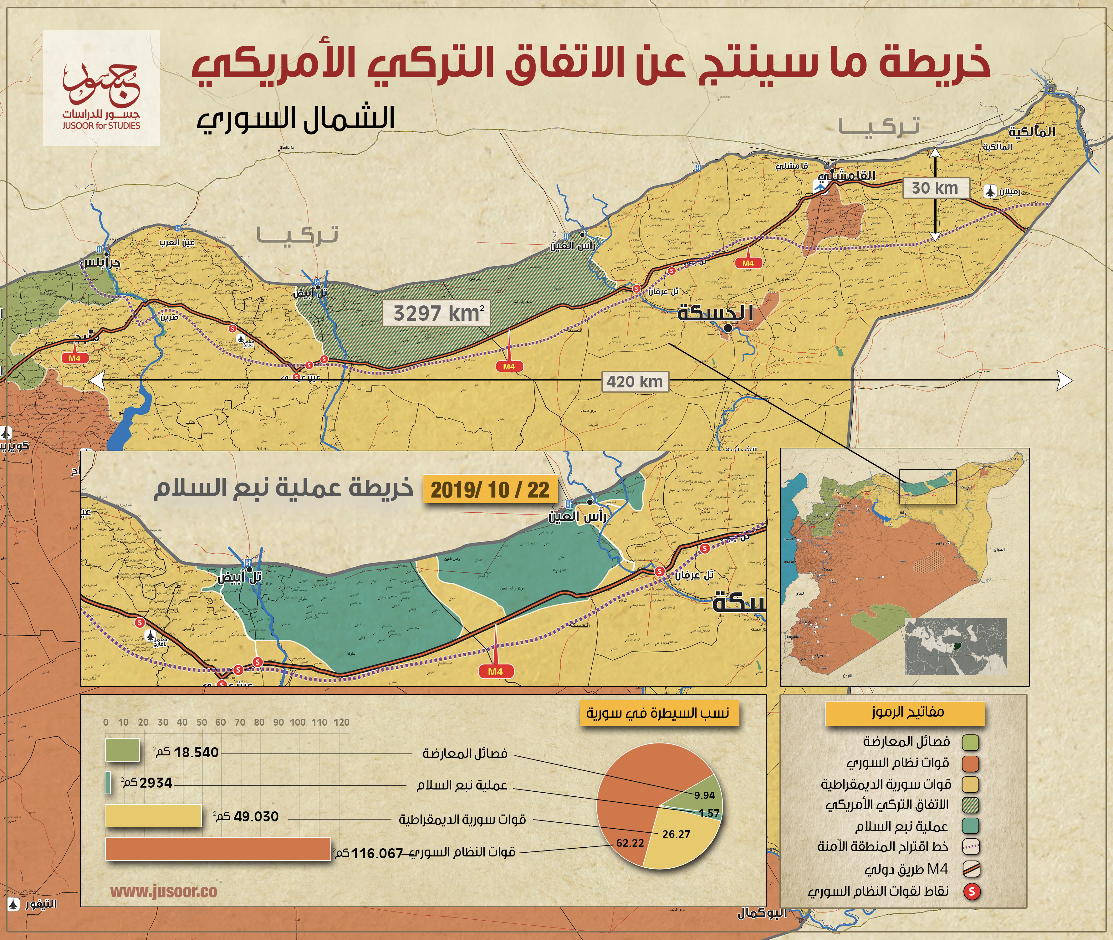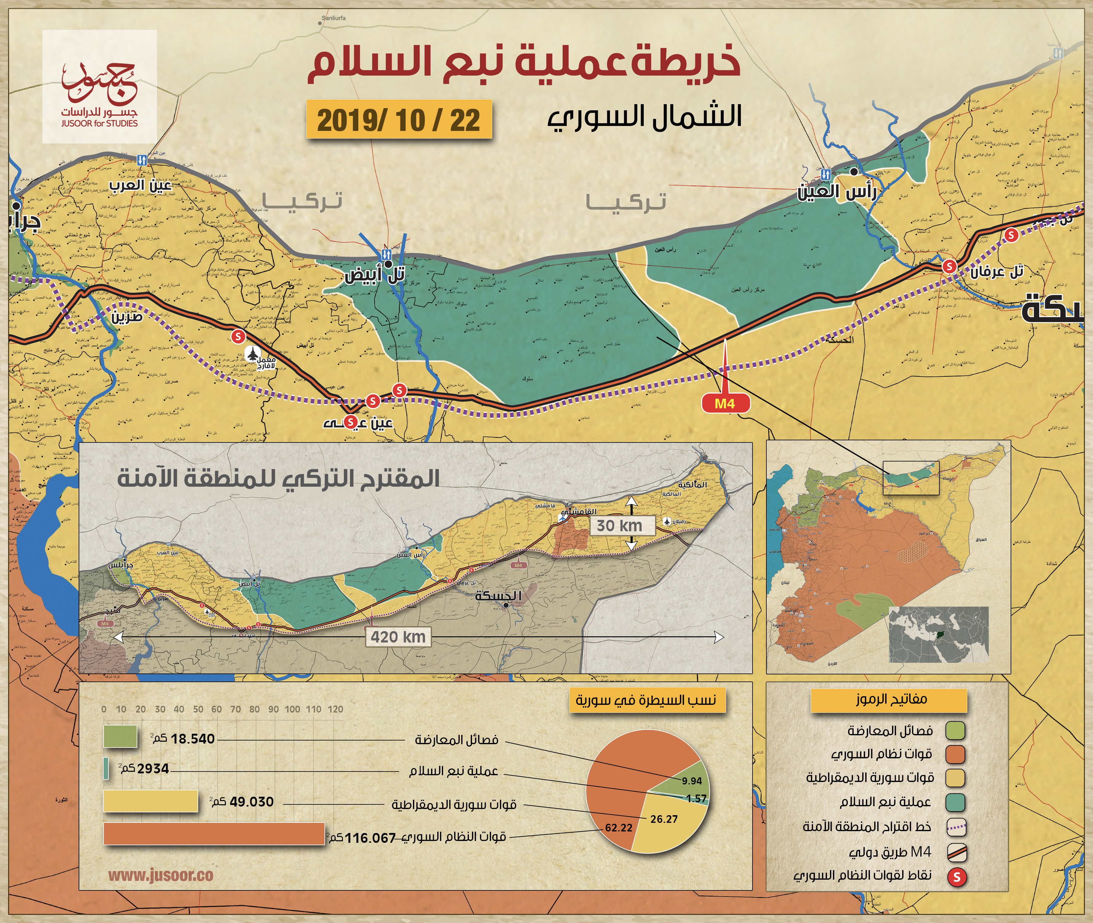 أظهرت خريطة النفوذ العسكري في سورية حتى 22 تشرين الأول/ أكتوبر 2019 اختلافاً جديداً في نسب السيطرة الكلية بين القوى المتصارعة على الأرض السورية مقارنة مع النسب التي تم تسجيلها في 15 تشرين الأول/ أكتوبر.