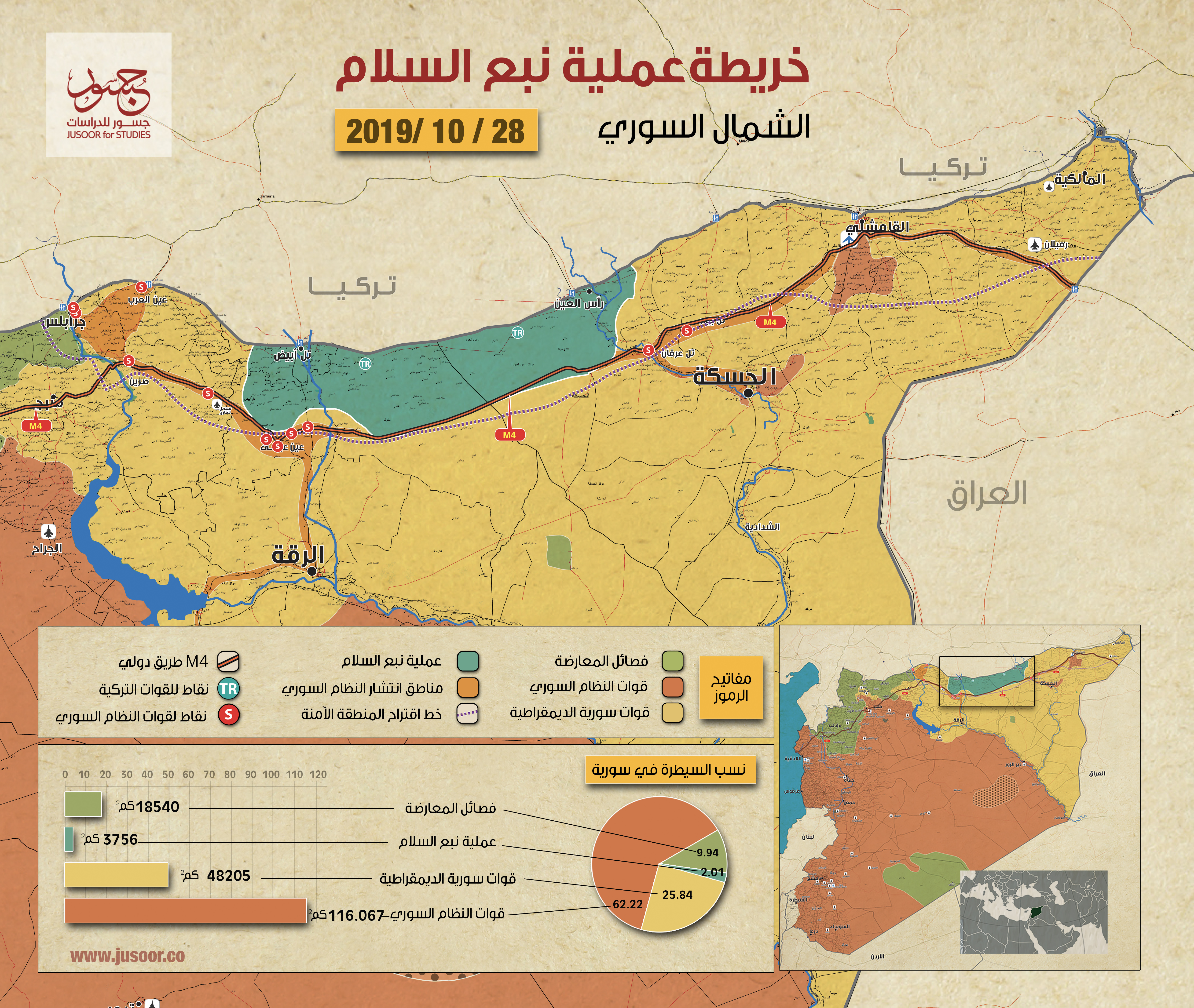 أظهرت خريطة النفوذ العسكري في سورية حتى 28 تشرين الأول/ أكتوبر 2019 اختلافاً جديداً في نسب السيطرة الكلية بين القوى المتصارعة على الأرض السورية مقارنة مع النسب التي تم تسجيلها في 22 تشرين الأول/ أكتوبر.