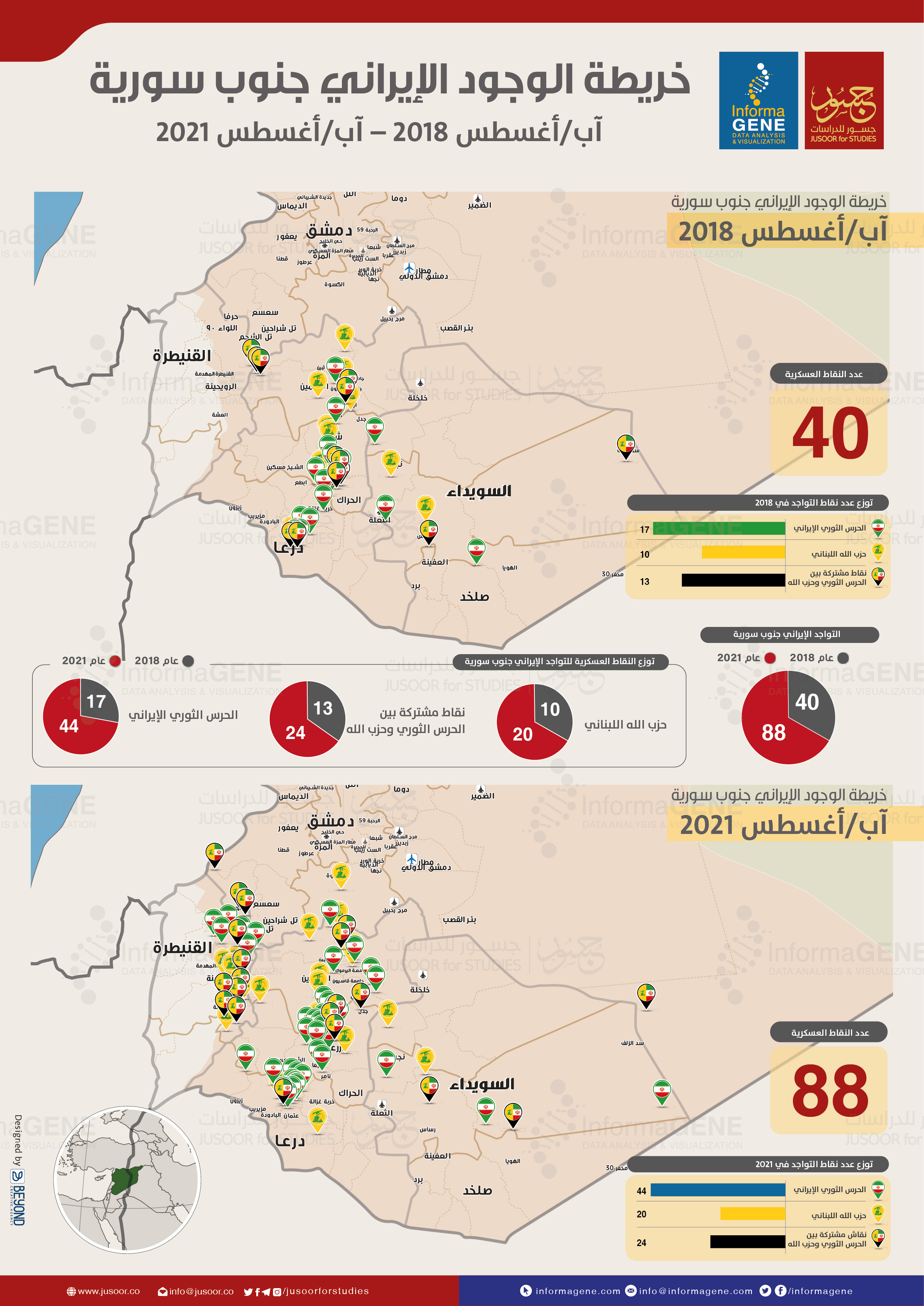 ولتوضيح ذلك يُصدِر مركز جسور للدراسات بالتعاون مع منصة إنفورموجين لتحليل البيانات خريطة مُقارَنة تظهر حجم انتشار النقاط الإيرانية الخاصة بالحرس الثوري الإيراني والخاصة بحزب الله اللبناني والمشتركة بينهما، وذلك كما هي الآن في محافظات جنوب سورية (السويداء – درعا – القنيطرة) مُقارَنةً مع عددها عام 2018، حيث توضح الخريطة عدم ابتعاد الميليشيات الإيرانية المسافة المتفَق عليها عن الحدود الإسرائيلية، بل ازدياد عدد النقاط الأمنية والعسكرية في كامل المناطق الحدودية.