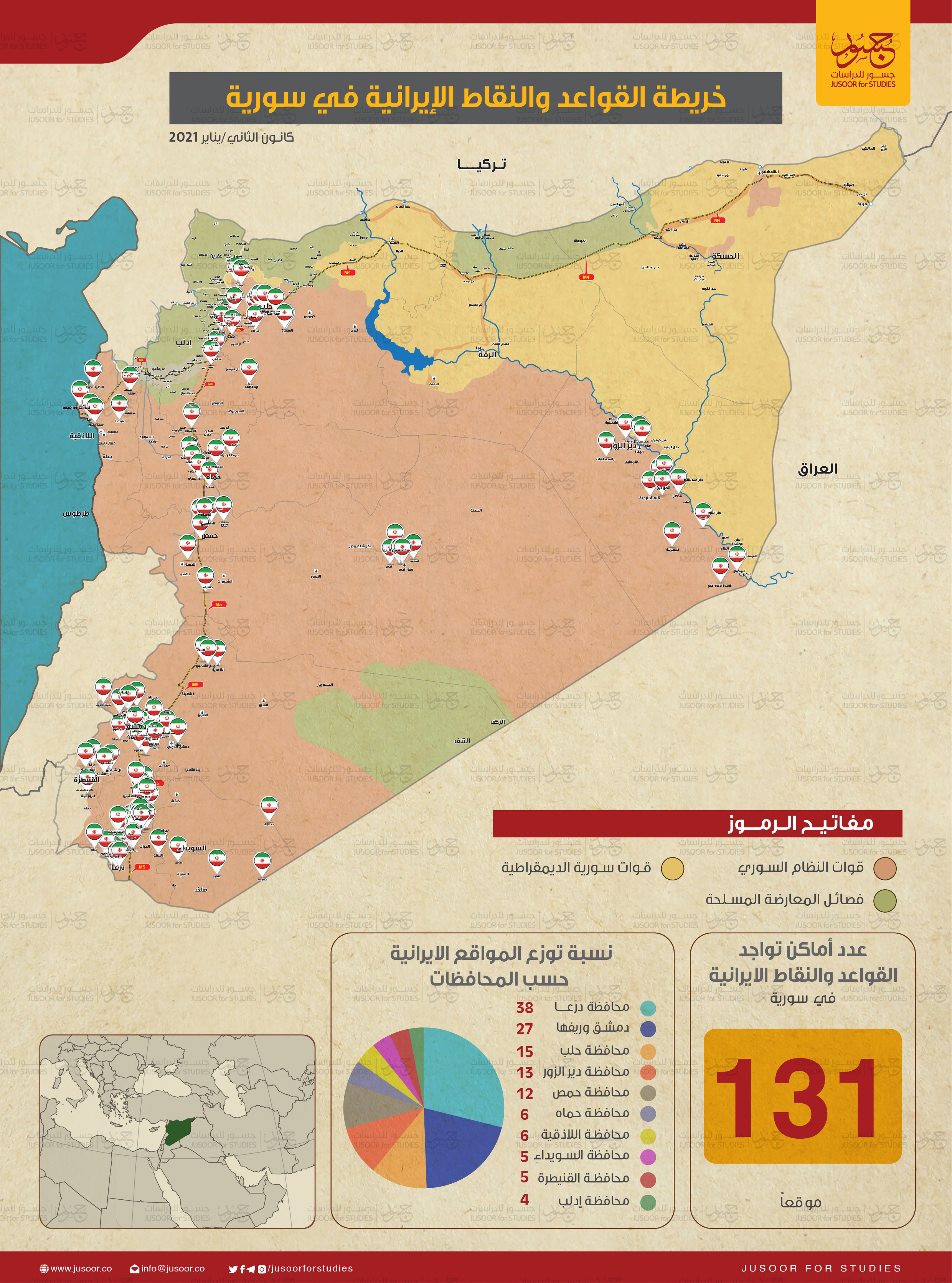 تمتلك إيران 131 موقعاً عسكرياً في سورية بين قاعدة ونقطة تواجد، وذلك ضمن 10 محافظات وهي: 38 في درعا، و27 في دمشق وريفها، و15 في حلب، و13 في دير الزور، و12 في حمص، و6 في حماة، و6 في اللاذقية، و5 في السويداء، و5 في القنيطرة، و4 في إدلب.