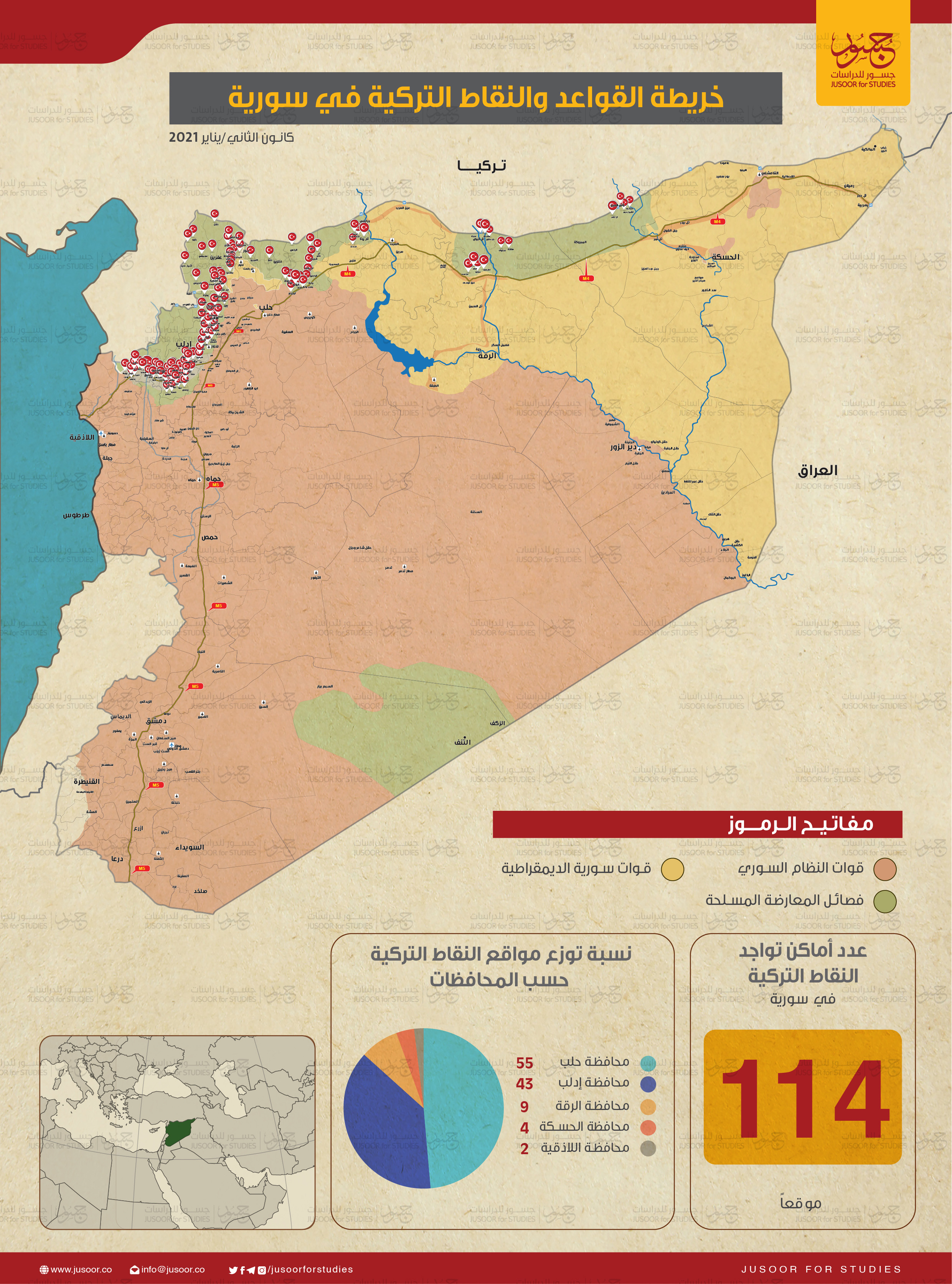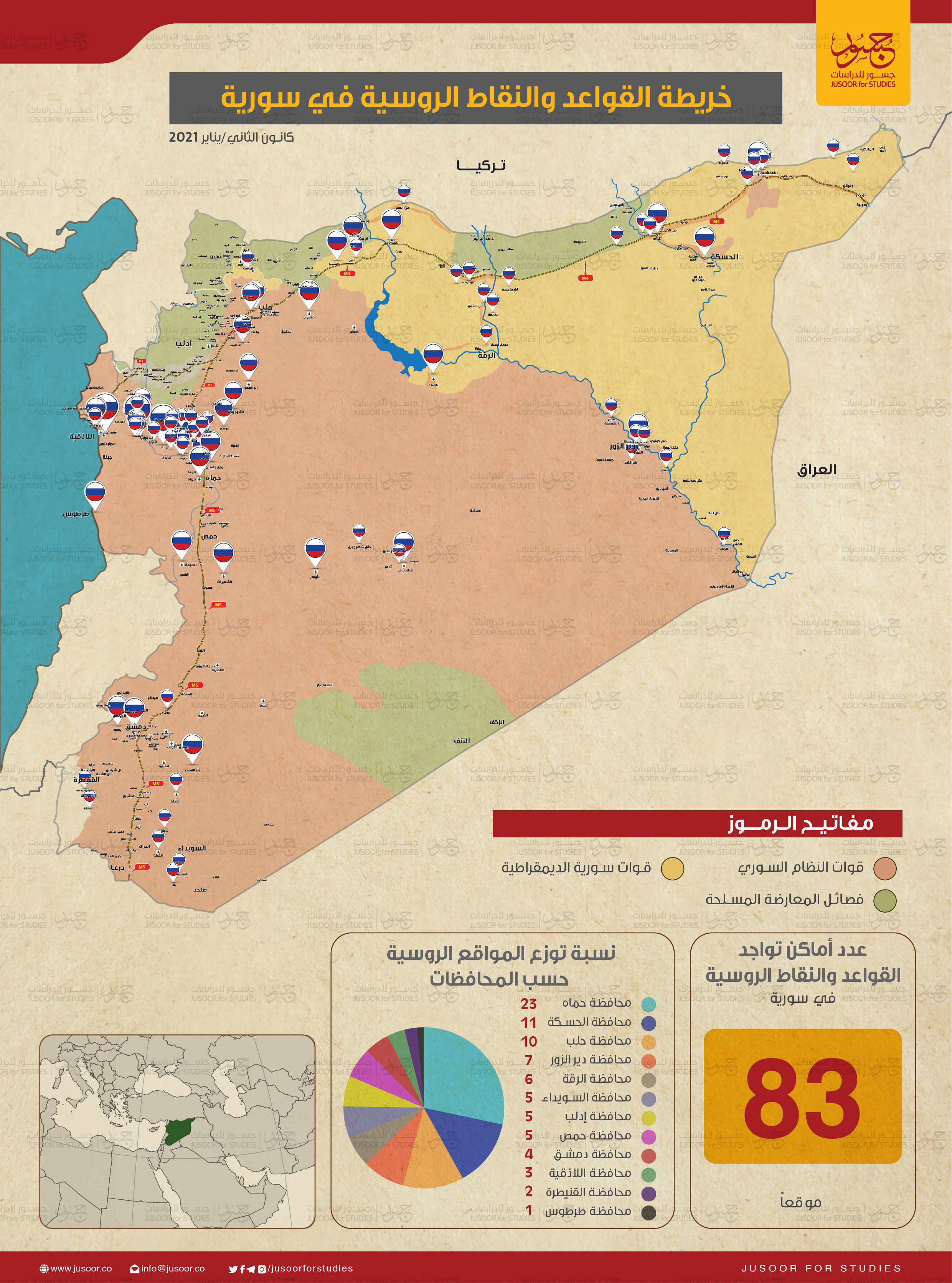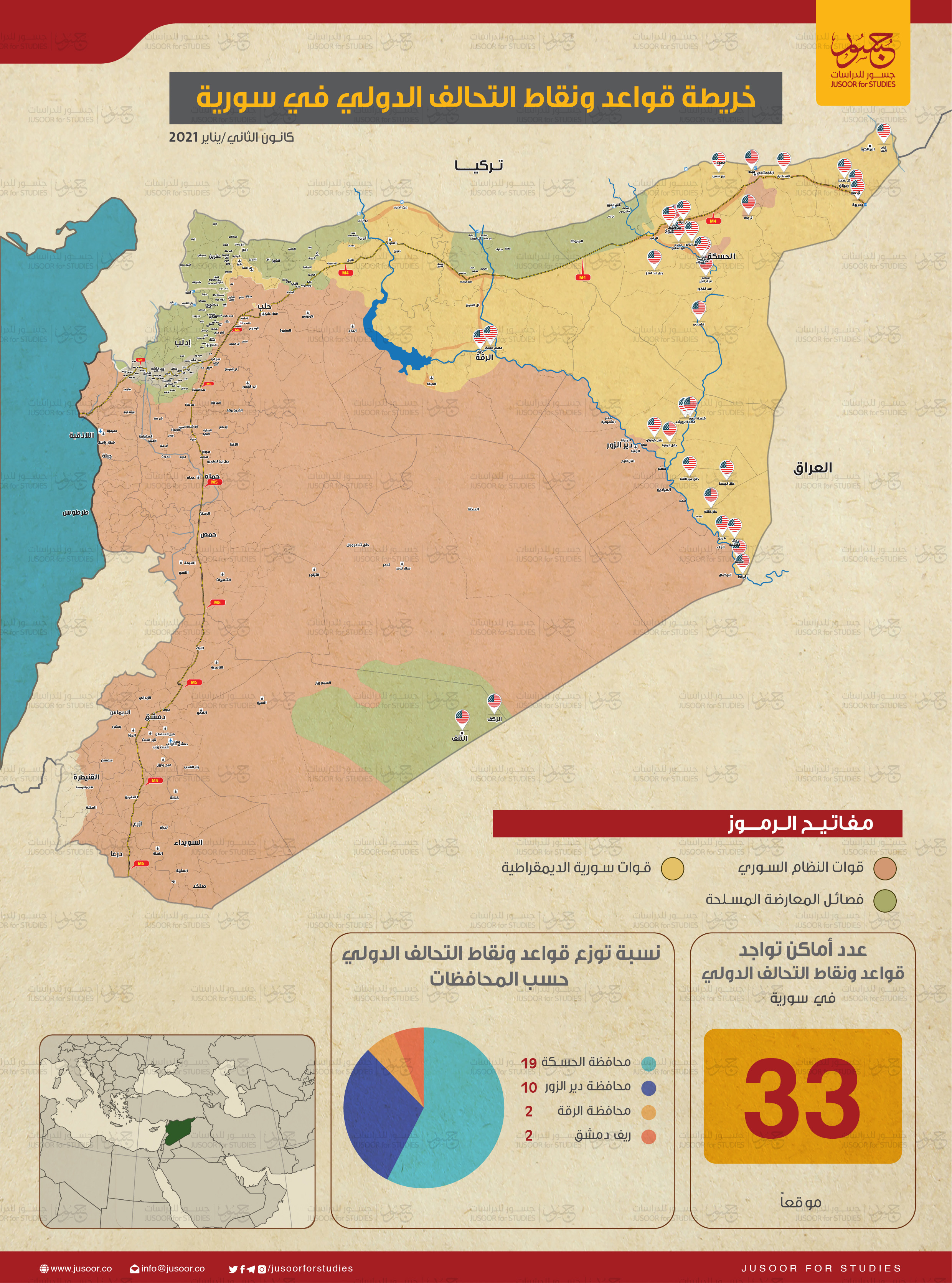 أصدر مركز جسور للدراسات في 5 كانون الثاني/ يناير 2021، خريطة تُظهر توزّع القوات الأجنبية في سورية، والتي بلغ مجموعها 477 موقعاً. وتشمل خريطة الفاعلين كلّاً من التحالف الدولي الذي تقوده الولايات المتّحدة الأمريكية، وروسيا، وتركيا، وإيران، وحزب الله.