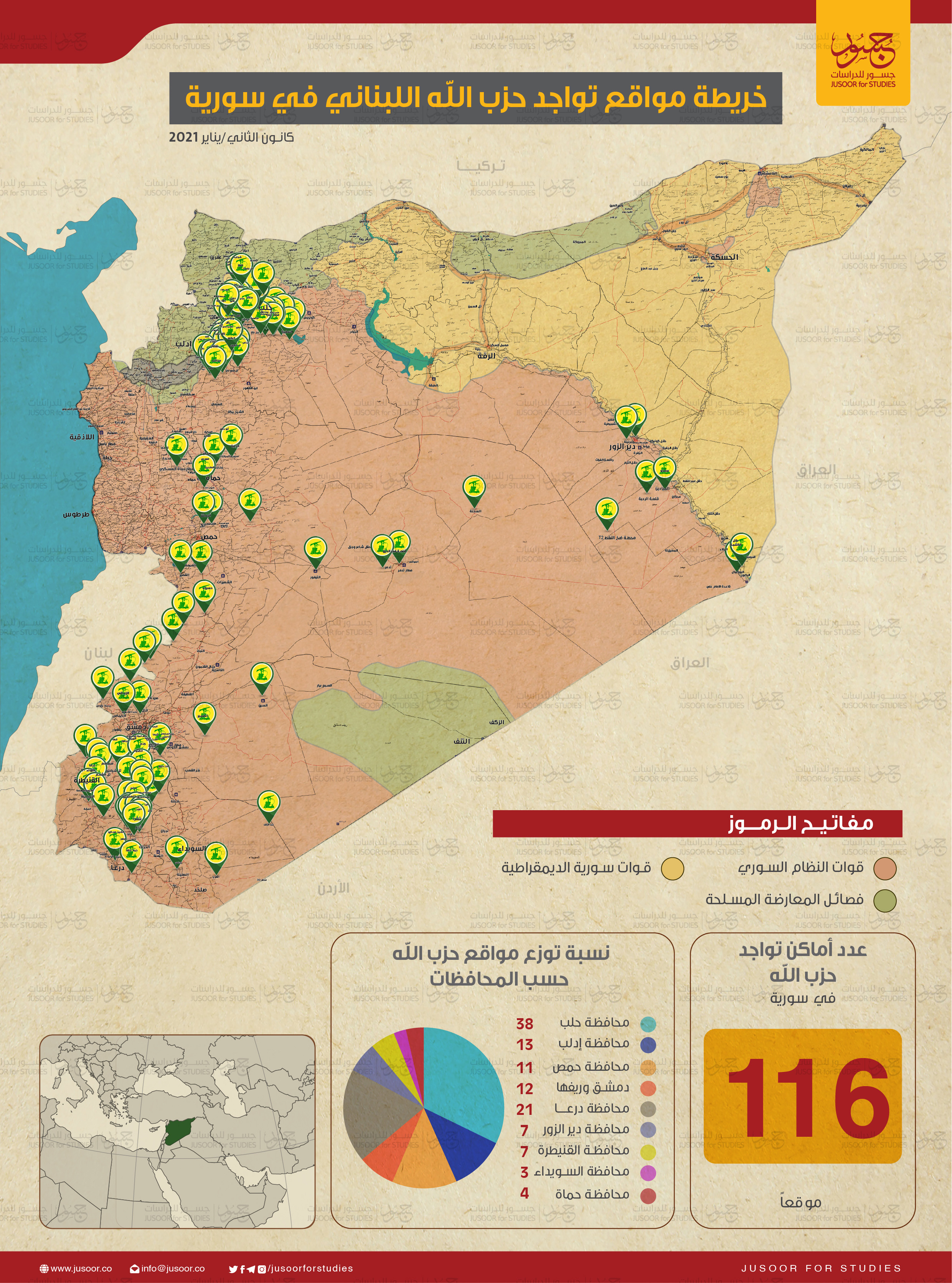 يمتلك حزب الله 116 موقعاً عسكرياً في سورية على شكل نقاط مستقلّة أو مشتركة أو شبه مشتركة مع القوات الإيرانية، وذلك ضمن 9 محافظات وهي على النحو التالي: 38 في حلب، و13 في إدلب، و11 في حمص، و12 في دمشق وريفها، و21 في درعا، و7 في دير الزور، و7 في القنيطرة، و3 في السويداء، و4 في حماة.