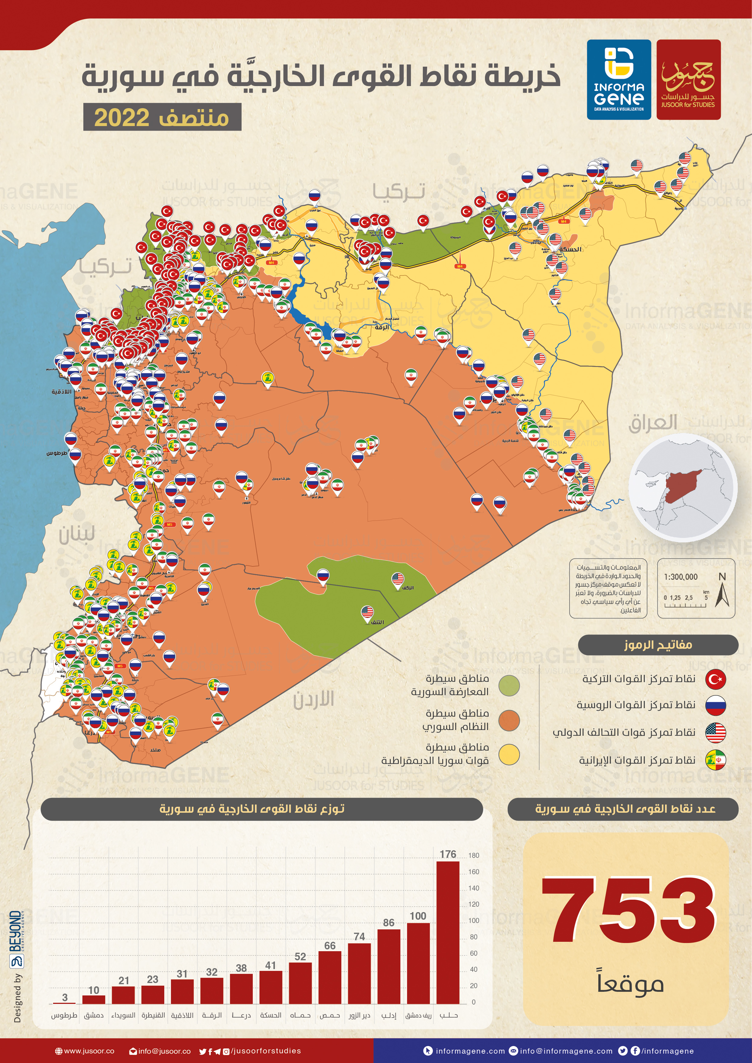 ينشر "مركز جسور للدراسات" بالتعاون مع "منصة إنفورماجين لتحليل البيانات" خرائط تحليلية للمواقع العسكرية لمختلف القوى الخارجية المتدخّلة عسكرياً وبشكل مباشر في سورية، حيث وصل عدد هذه القواعد والنقاط العسكرية الأجنبية مع نهاية النصف الأول من عام 2022 إلى 753 موقعاً، ويعكس هذا الرقم حجم التأثير الكبير والمتزايد للأطراف الخارجية في الملف السوري، على حساب التأثير الداخلي الضعيف للفاعلين المحليين جميعاً.