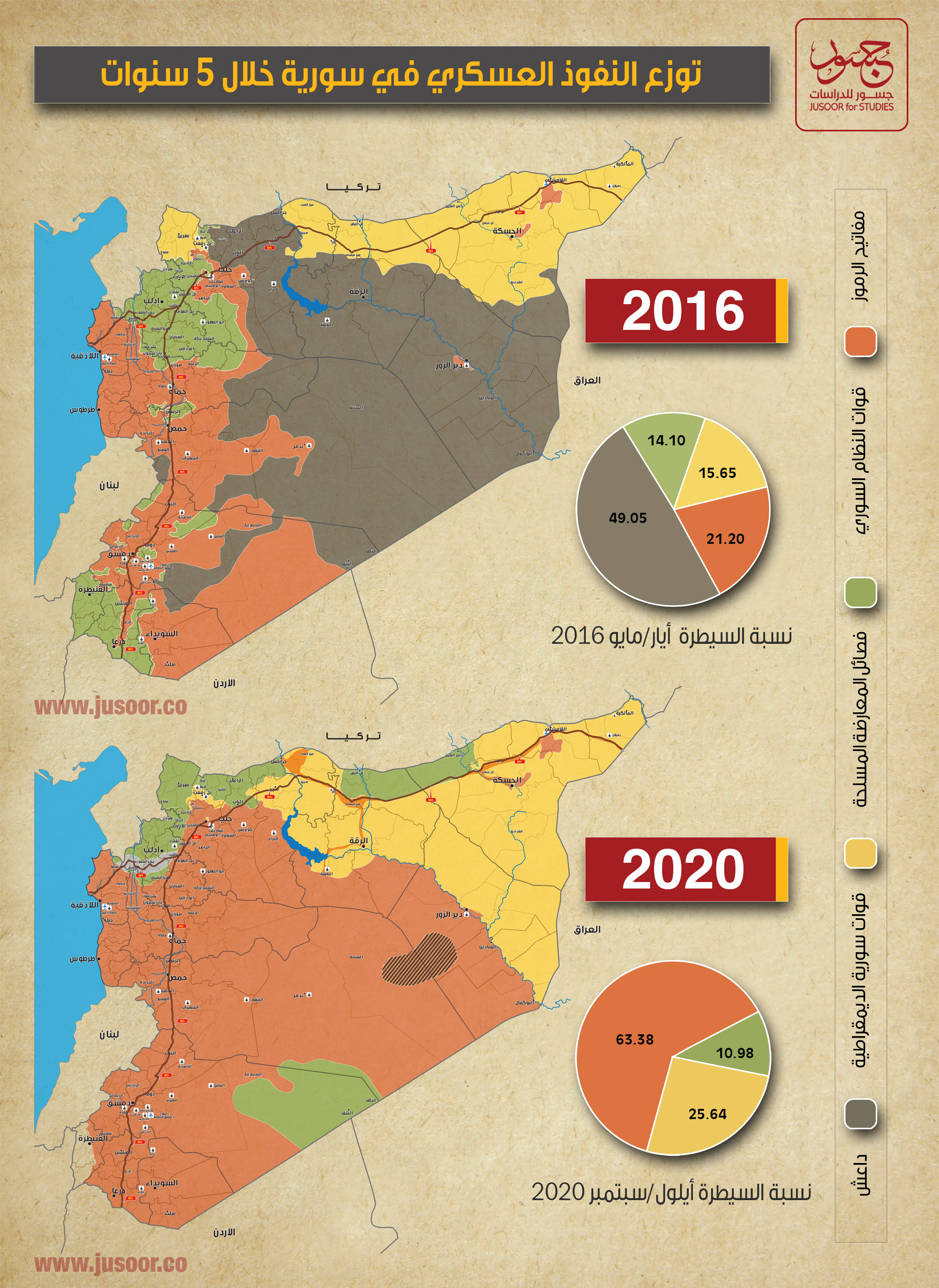 وكان النظام عند بدء التدخُّل الروسي في نهاية أيلول/سبتمبر 2015 يُسيطر فقط على حوالي ربع الأراضي السورية(13)، فيما أصبح يُسيطر في نهاية أيلول/سبتمبر 2020 على حوالي 63.3% من الأرض(14).