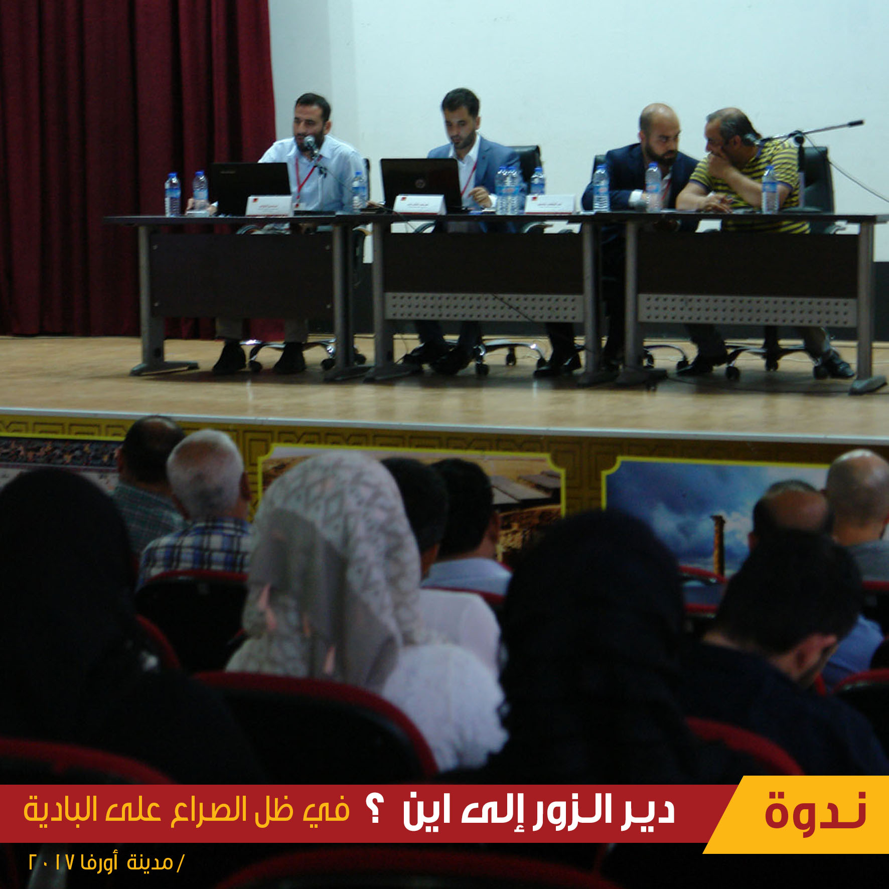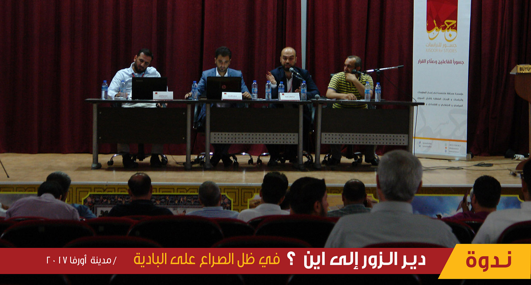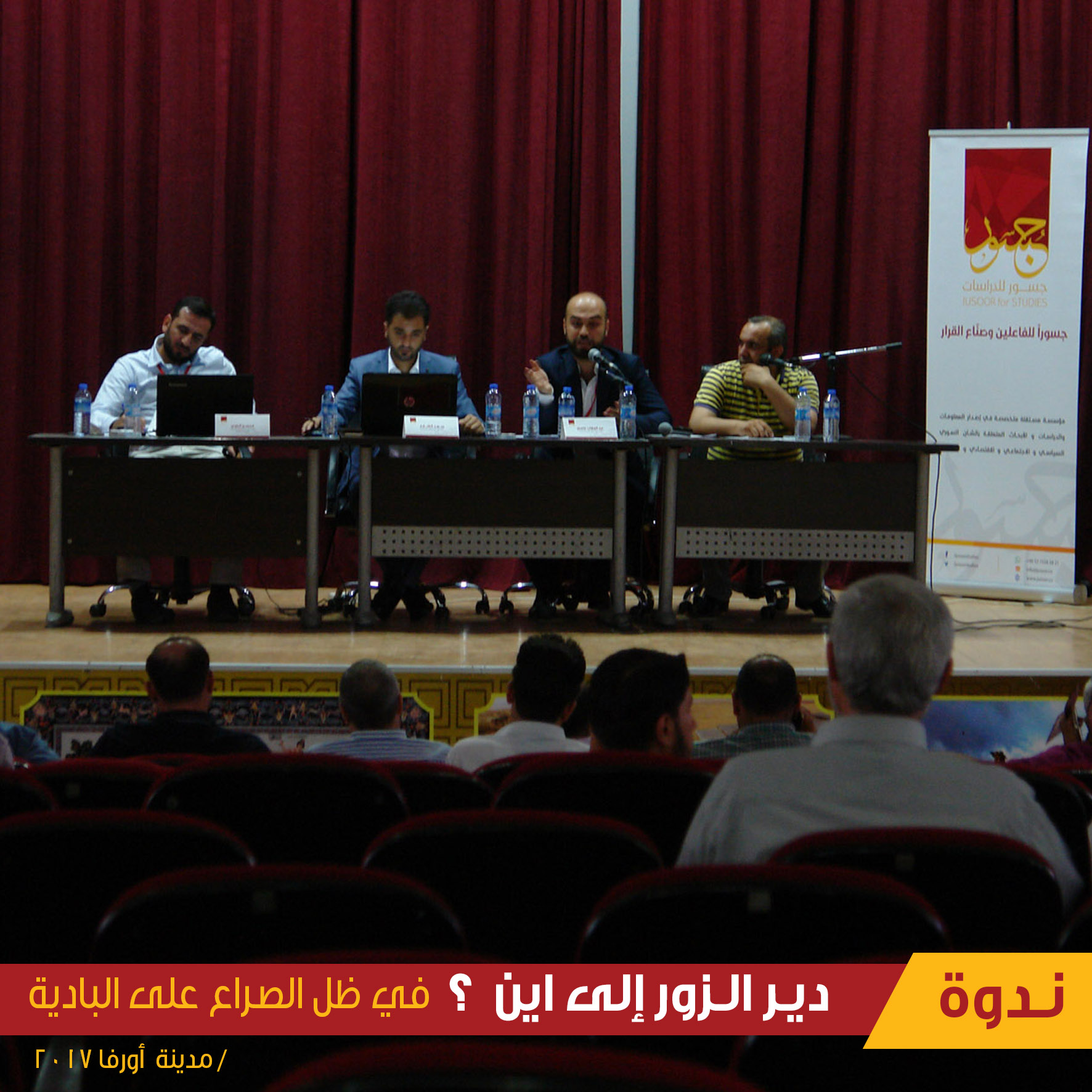 أقام مركز جسور للدراسات السبت الماضي 1 تموز/ يوليو 2017، ندوة حوارية في مدينة أورفا التركية، بعنوان "دير الزور إلى أين في ظل الصراع على البادية السورية؟"، وبحضور عدد من الفعاليات المحلية والمعنية بمستقبل المنطقة شرقي البلاد. وقد حاضر في الندوة كل من عبد الوهاب عاصي ممثلاً عن مركز جسور للدراسات، وسعد الشارع ممثلاً عن مركز الشرق للسياسات، ومحسن الراوي وهو باحث مختص في الشؤون الاقتصادية والجماعات الجهادية.