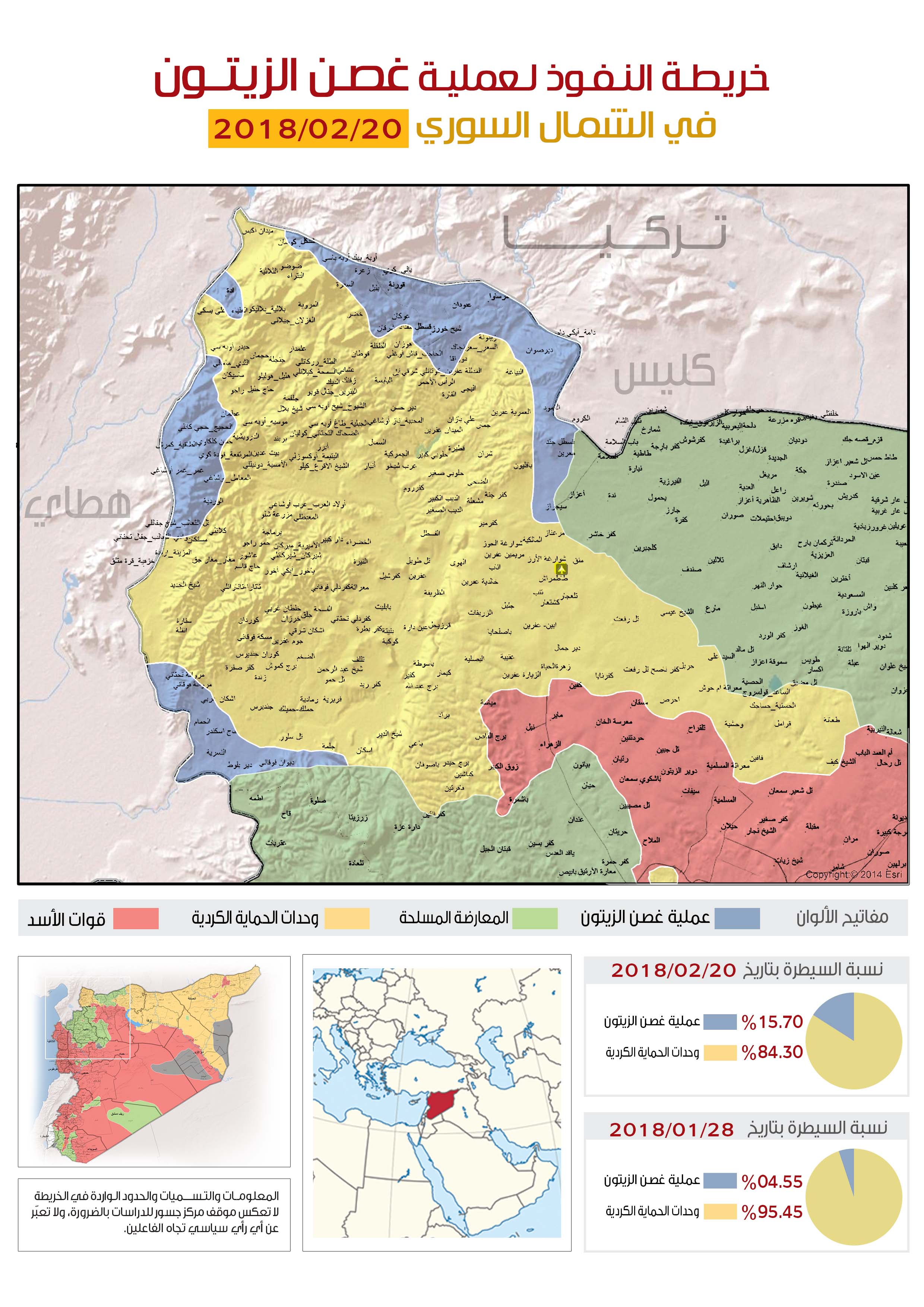 مع حلول 20 شباط/ فبراير 2018، يكون قد مرّ شهر بالتمام على بدء القوات المسلحة التركية وفصائل الجيش السوري الحر، معركة غصن الزيتون Zeytin Dalı في منطقة عفرين (60 كم شمال غرب حلب)، ضد وحدات الحماية الكردية، الجناح السوري لحزب العمال الكردستاني.