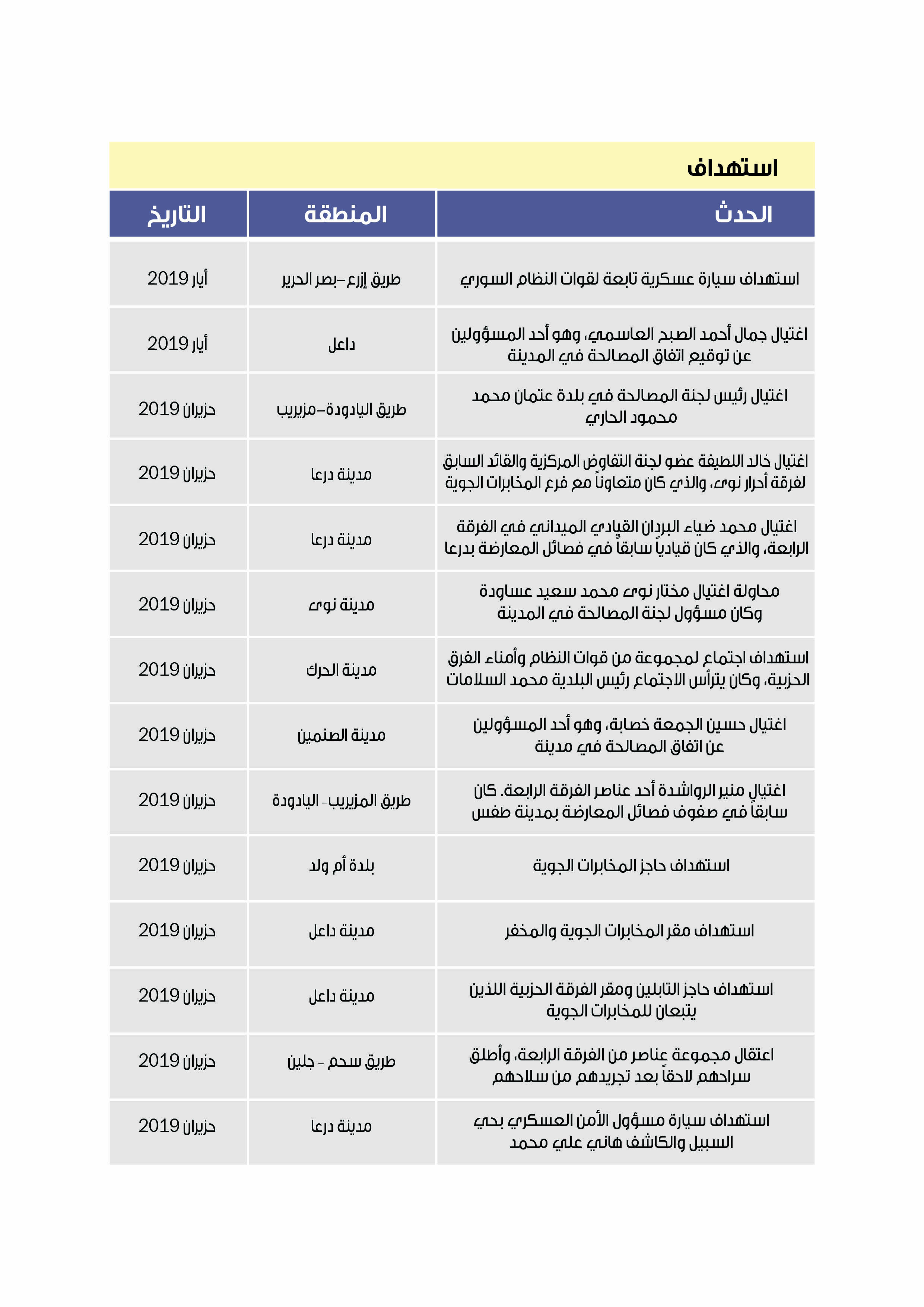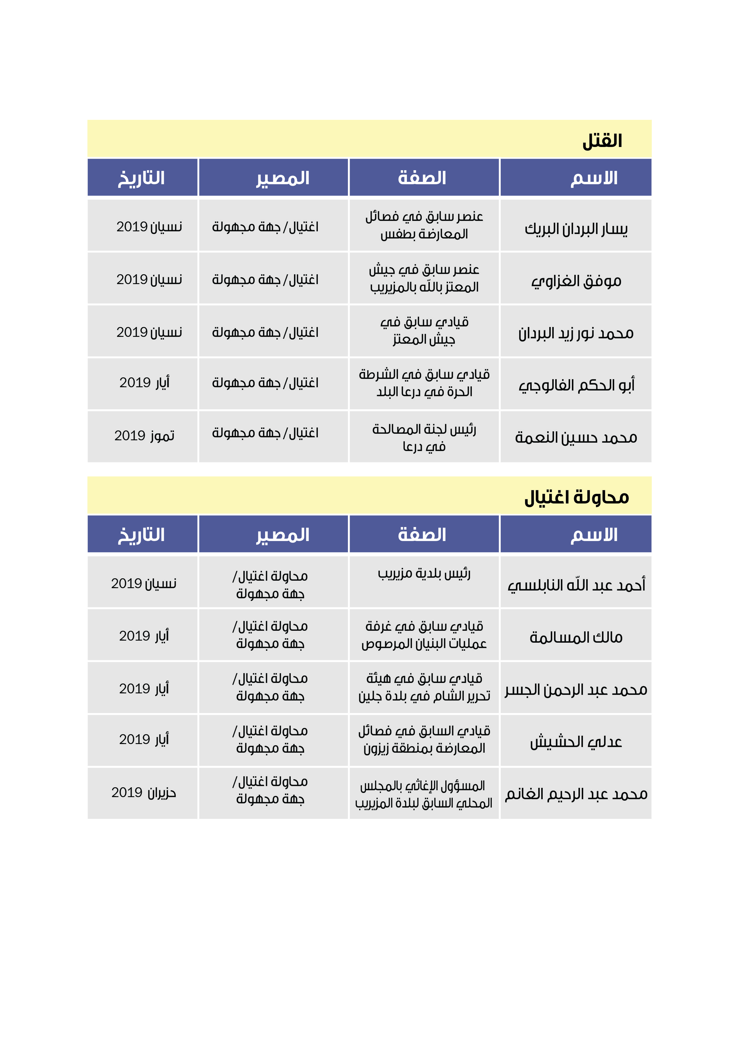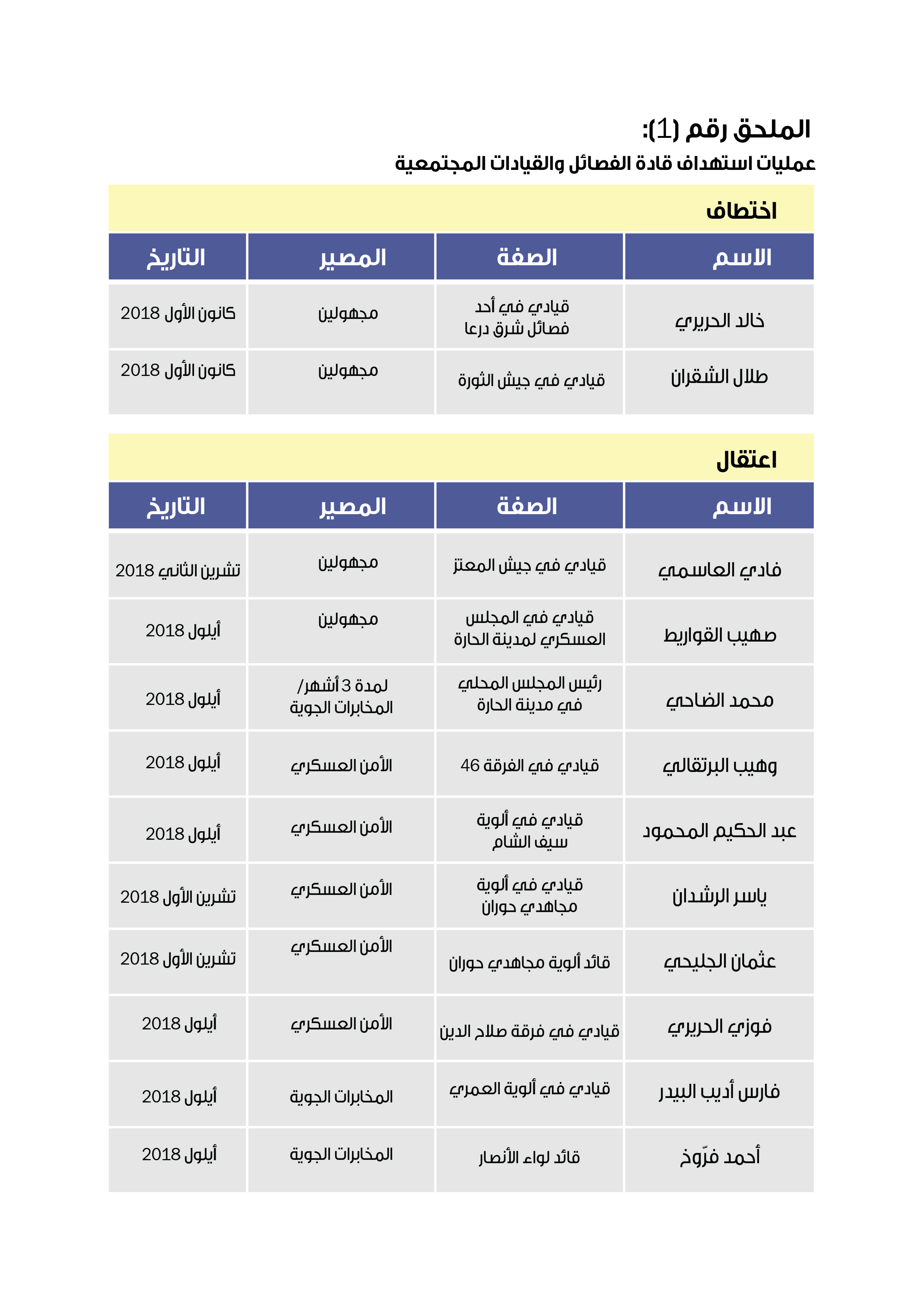 ومنذ توقيع اتفاق المصالحة في الجنوب السوري تعرّض أعضاء اللجنة وقيادات سابقة من المعارضة مدنيين وعسكريين ممن ساهموا في اتفاق التسوية، إلى حملات استهداف واسعة، حيث تعرّض العديد منهم إلى الاغتيال أو الاختطاف أو القتل، وقد استطاع فريق البحث رصد العديد من تلك المحاولات التي نجح بعضها وأخفق الآخر (انظر الملحق رقم -1-).