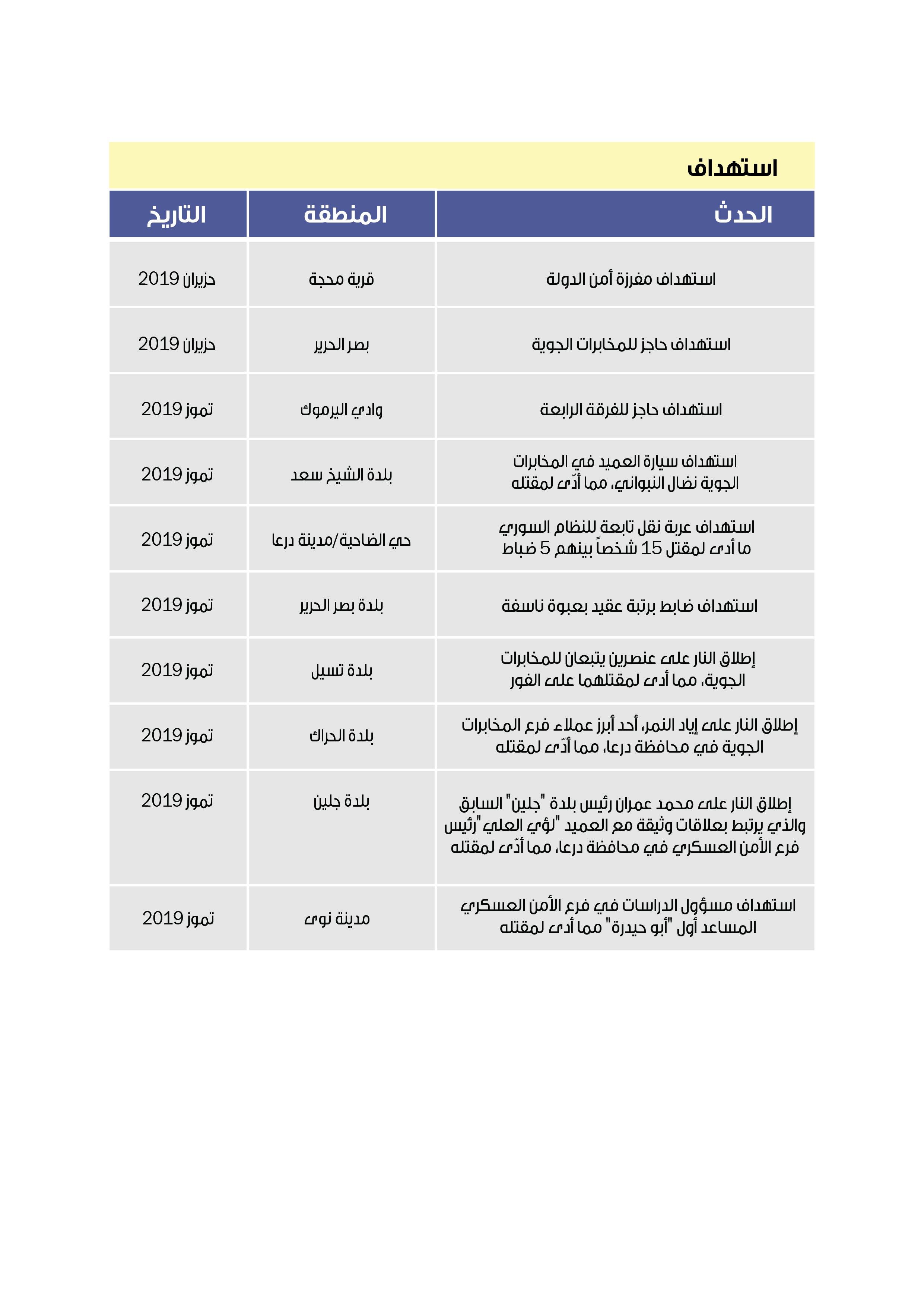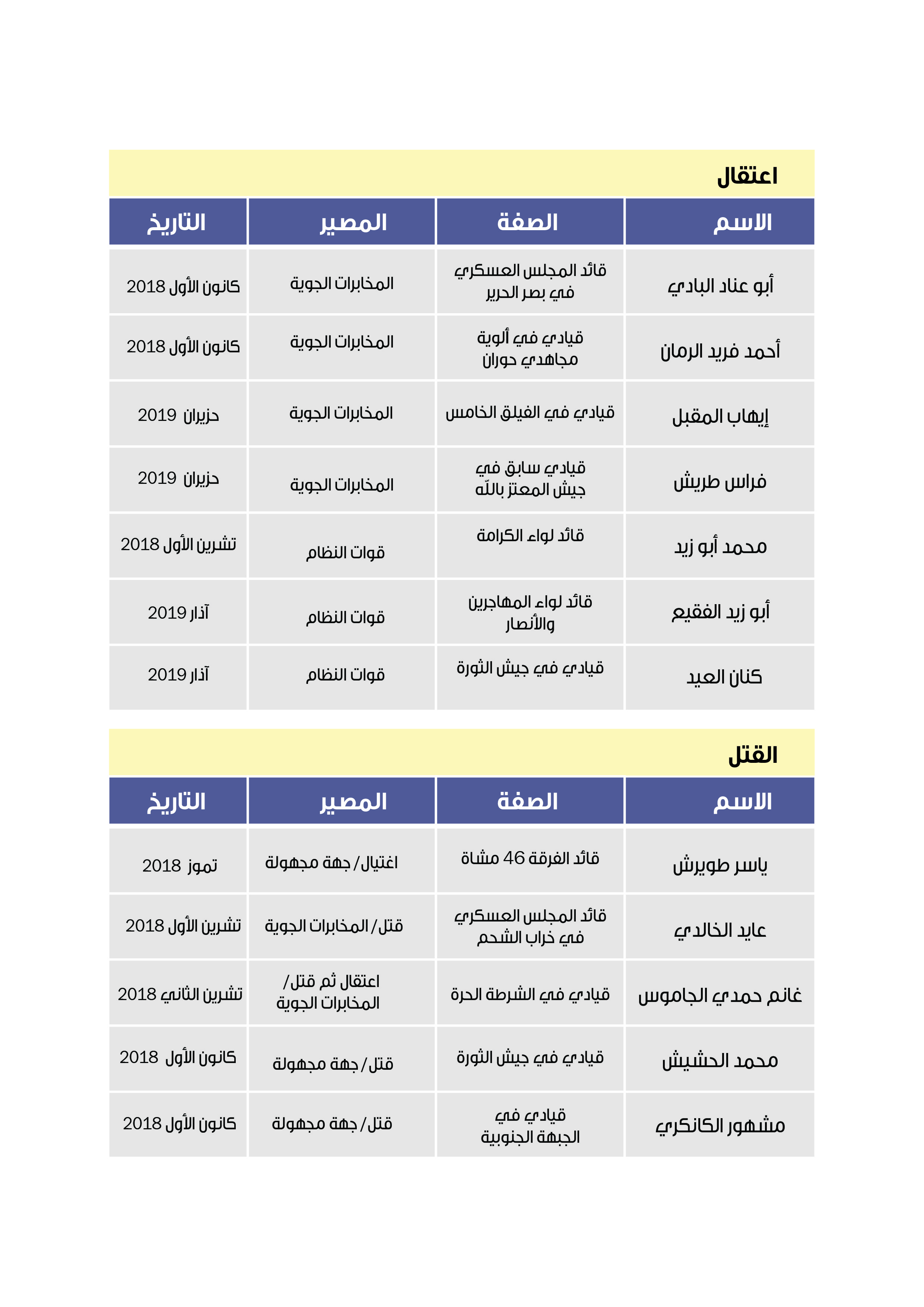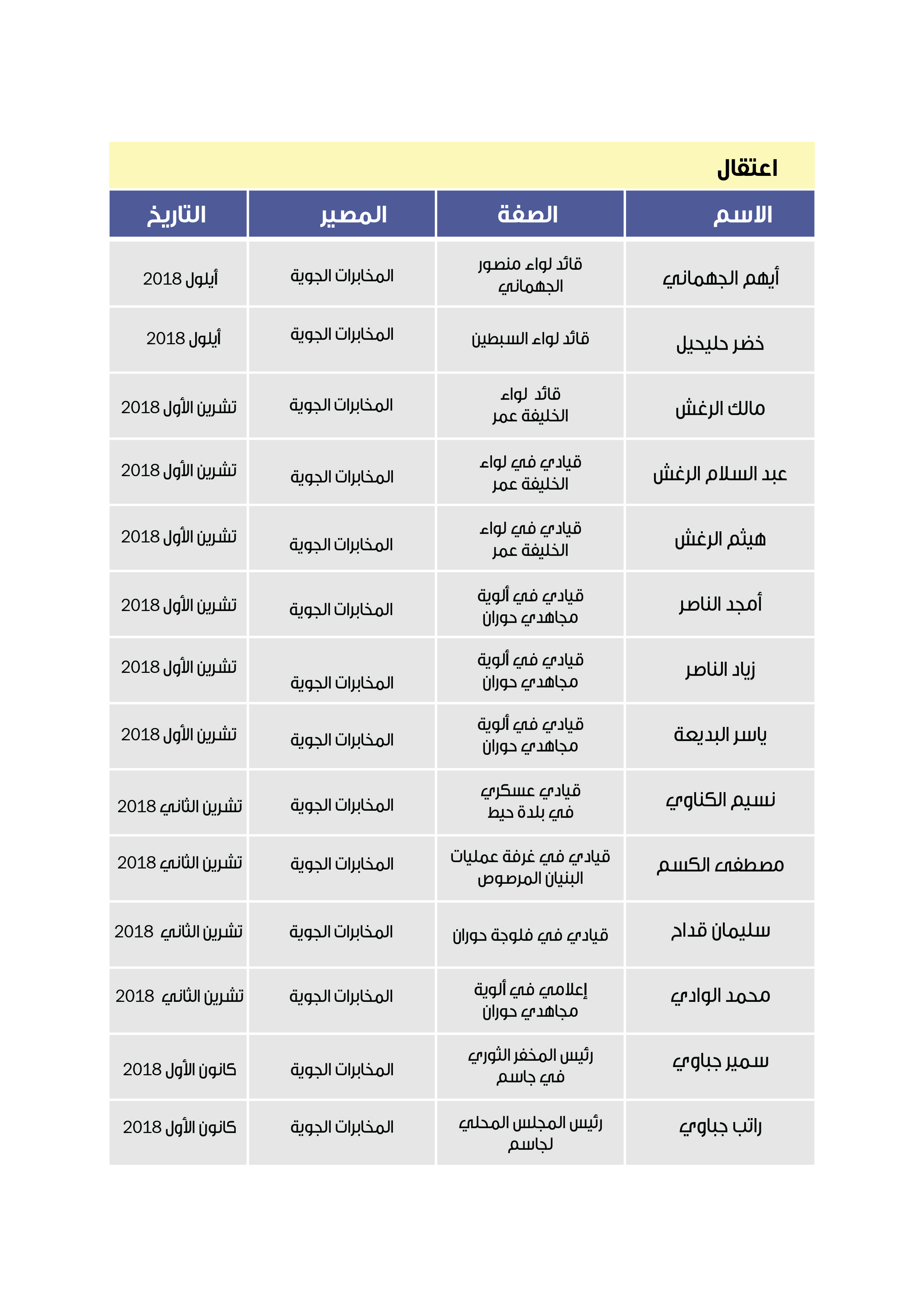 وقد وثق مكتب توثيق الشهداء في درعا اعتقال قوات النظام لـ 634 معتقلاً منذ 1 آب/أغسطس 2018 وحتى 31 تموز/يوليو 2019، تم إطلاق سراح 166 منهم في وقت لاحق، بينما قتل 9 منهم تحت التعذيب في سجون قوات النظام .