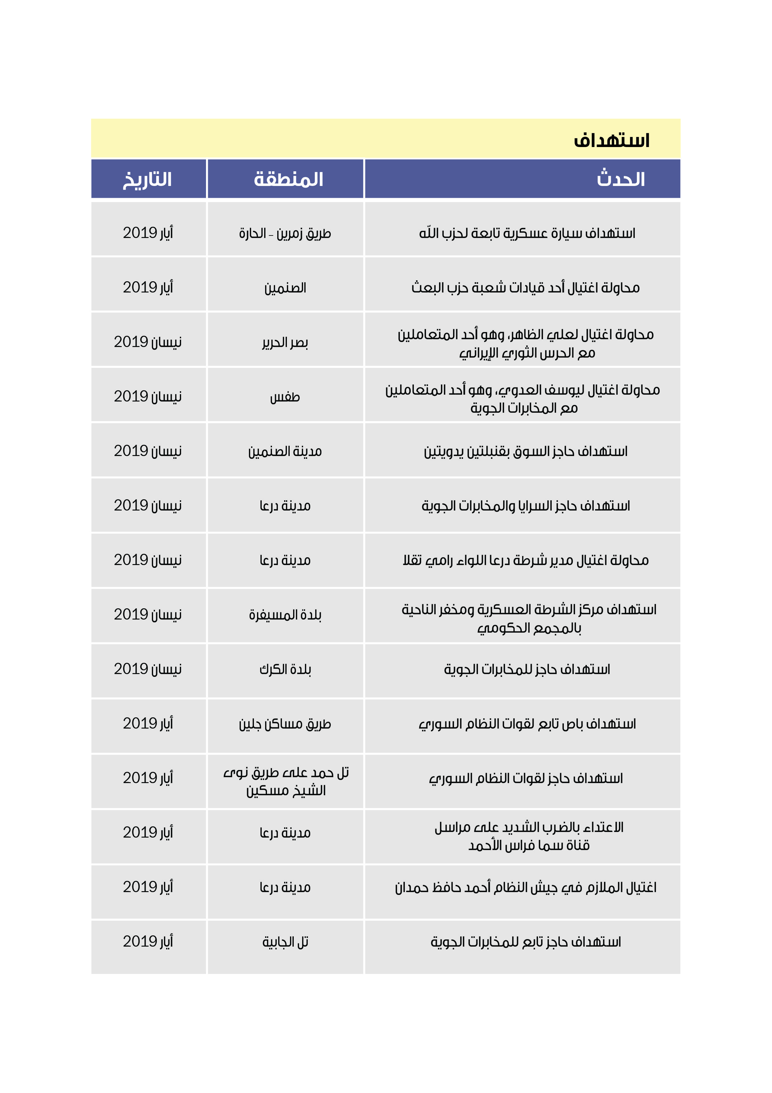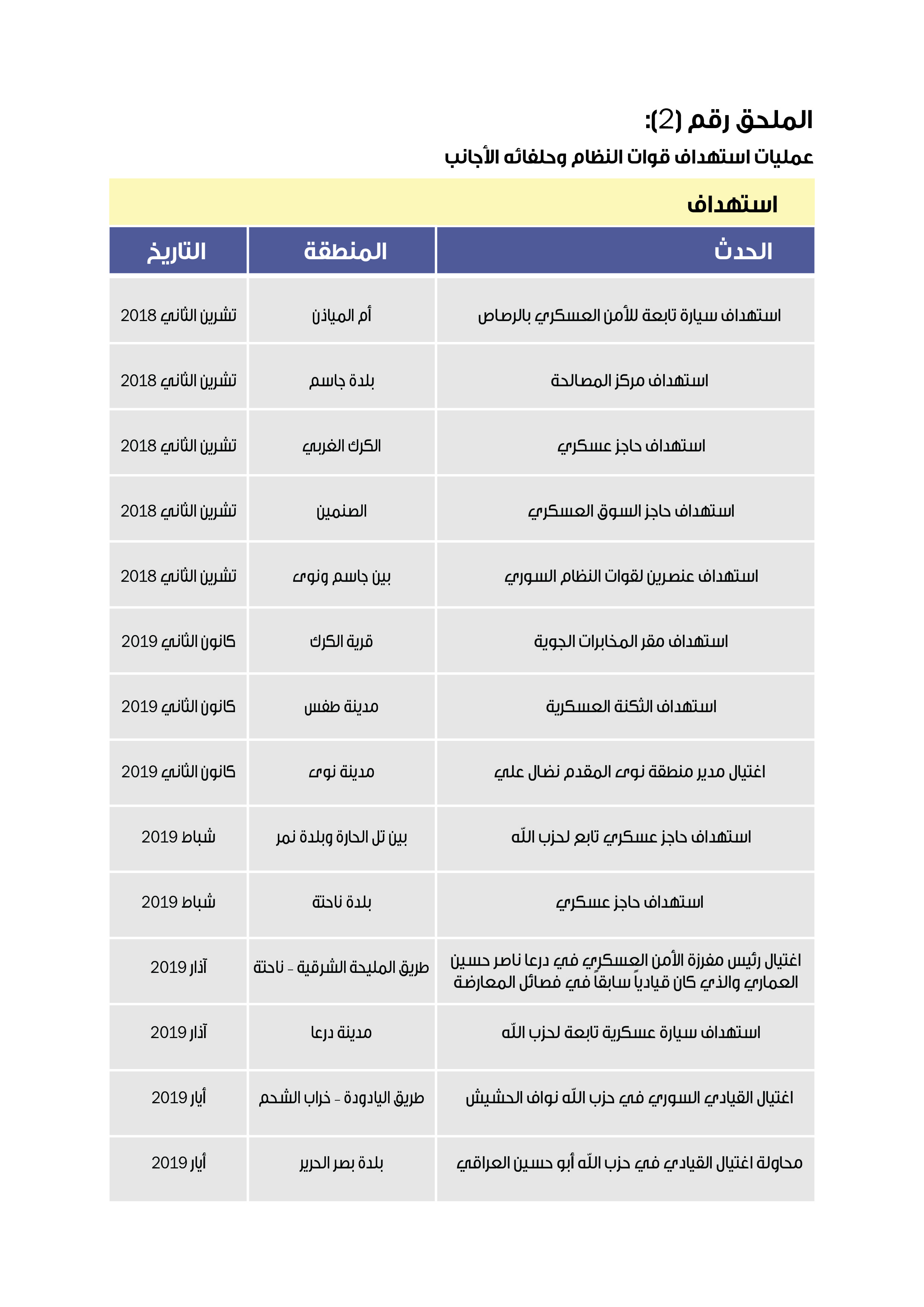 منذ توقيع اتفاقيات التسوية في الجنوب السوري تعرّضت مصالح النظام من مراكز أمنية وحواجز أو نقاط تفتيش ثابتة ومتحركة وعربات وقيادات عسكرية وشعب حزبية وغيرها، إلى عدد كبير من عمليات الاستهداف المسلّح التي كان العديد منها ينسب إلى مجموعة تُطلق على نفسها اسم المقاومة الشعبية، في حين سُجّلت أغلب الهجمات الأخرى باسم مجهولين. وقد استطاع فريق البحث من رصد حوالي 50 عملية بين اغتيال أو محاولة اغتيال، وسلب سلاح، واستهداف، ونصب كمائن وغير ذلك(انظر الملحق رقم -2-)