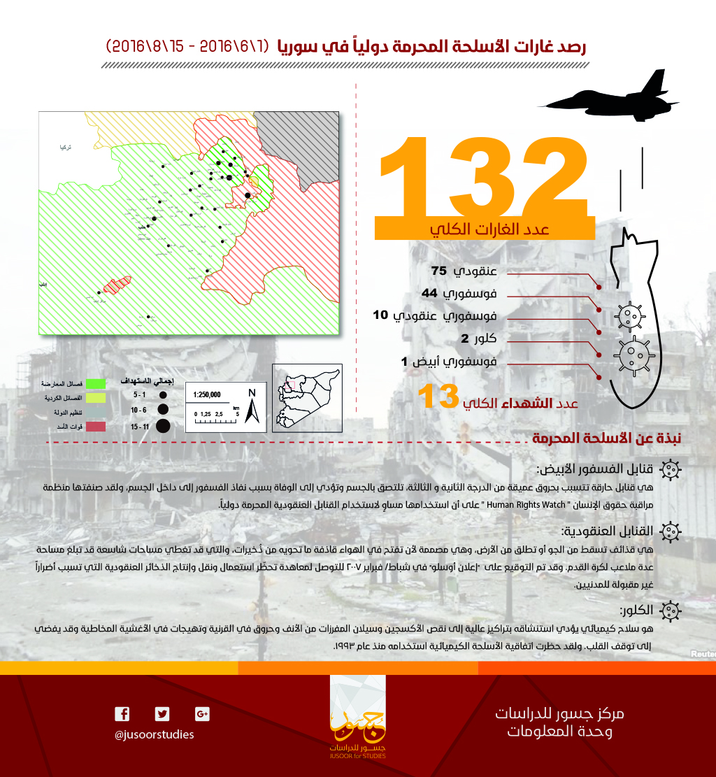 رصد مركز جسور للدراسات غارات الاسلحة المحرمة دولياً في سوريا في الفترة من 1/6/2016 الى 15/8/2016