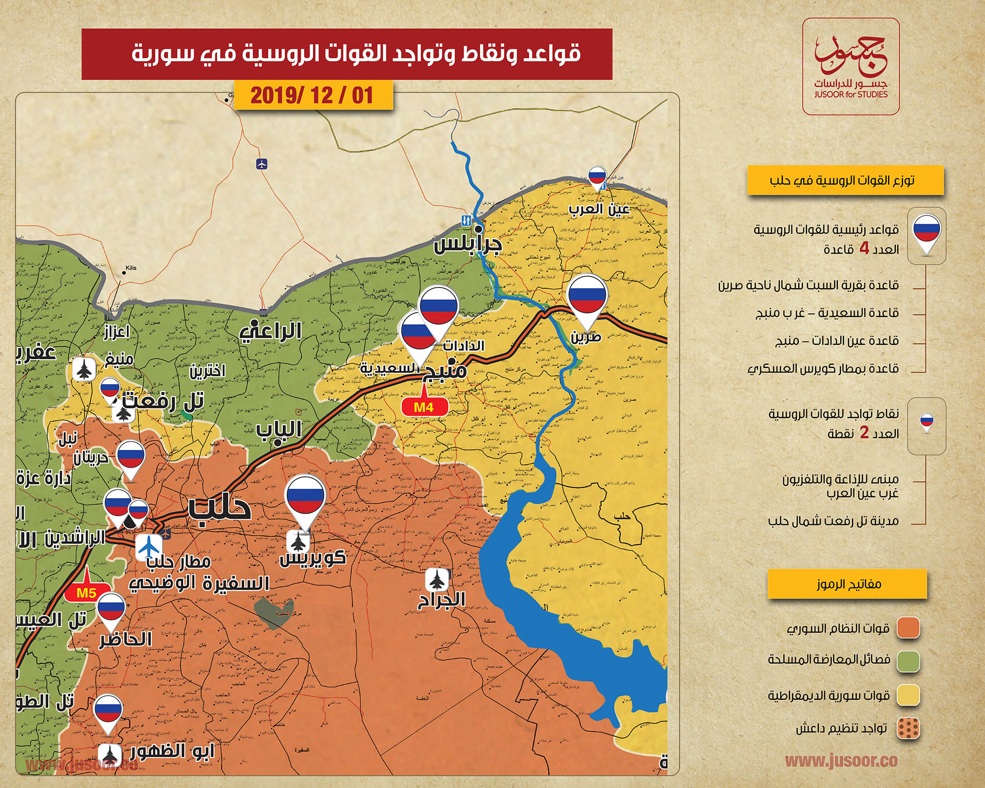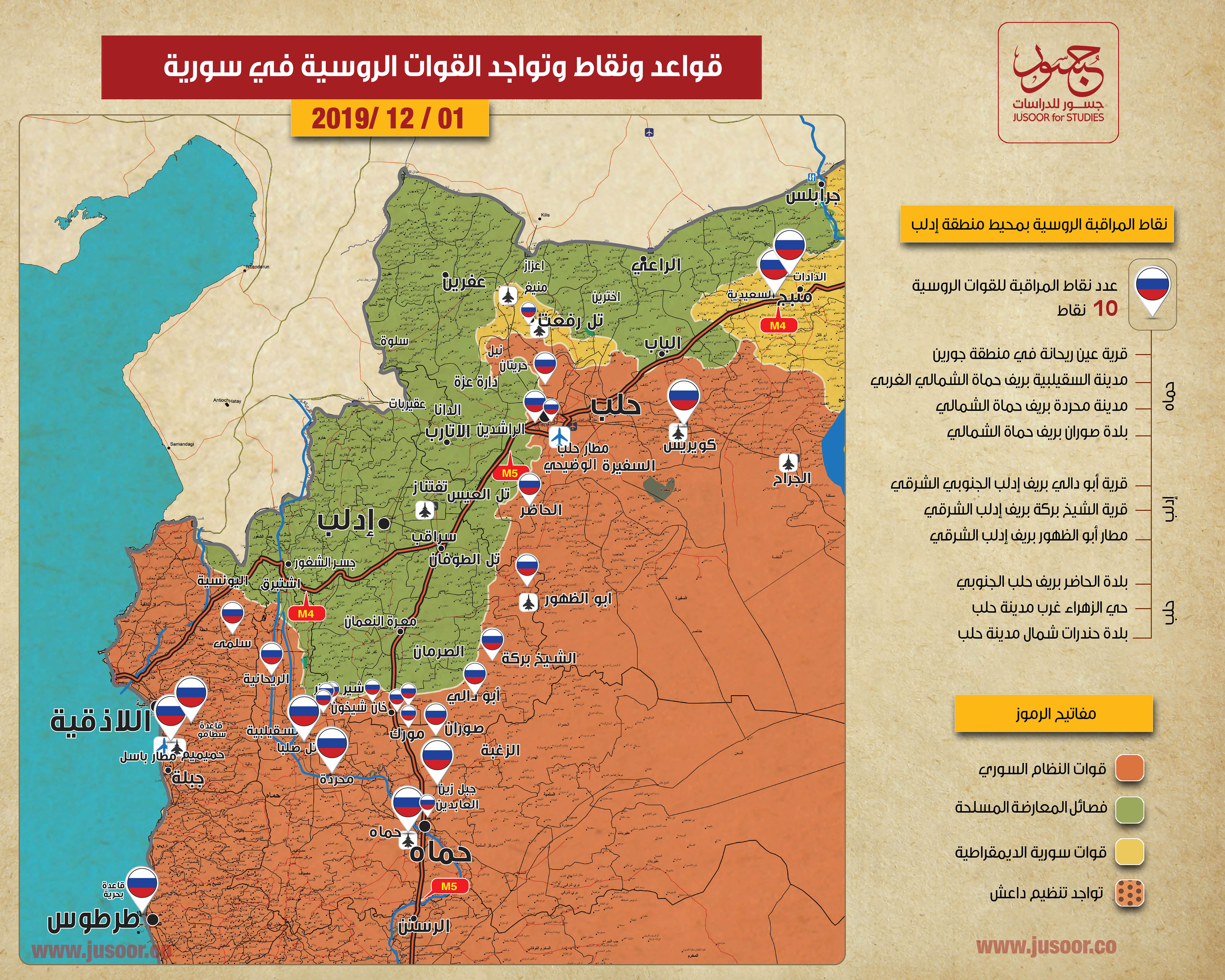 أصدر مركز جسور للدراسات خريطة لقواعد ونقاط التواجد الروسي في سورية. وشملت الخريطة 66 نقطة، منها 24 قاعدة عسكرية، و32 نقطة تواجد، و10 نقاط مراقبة في محيط محافظة إدلب.