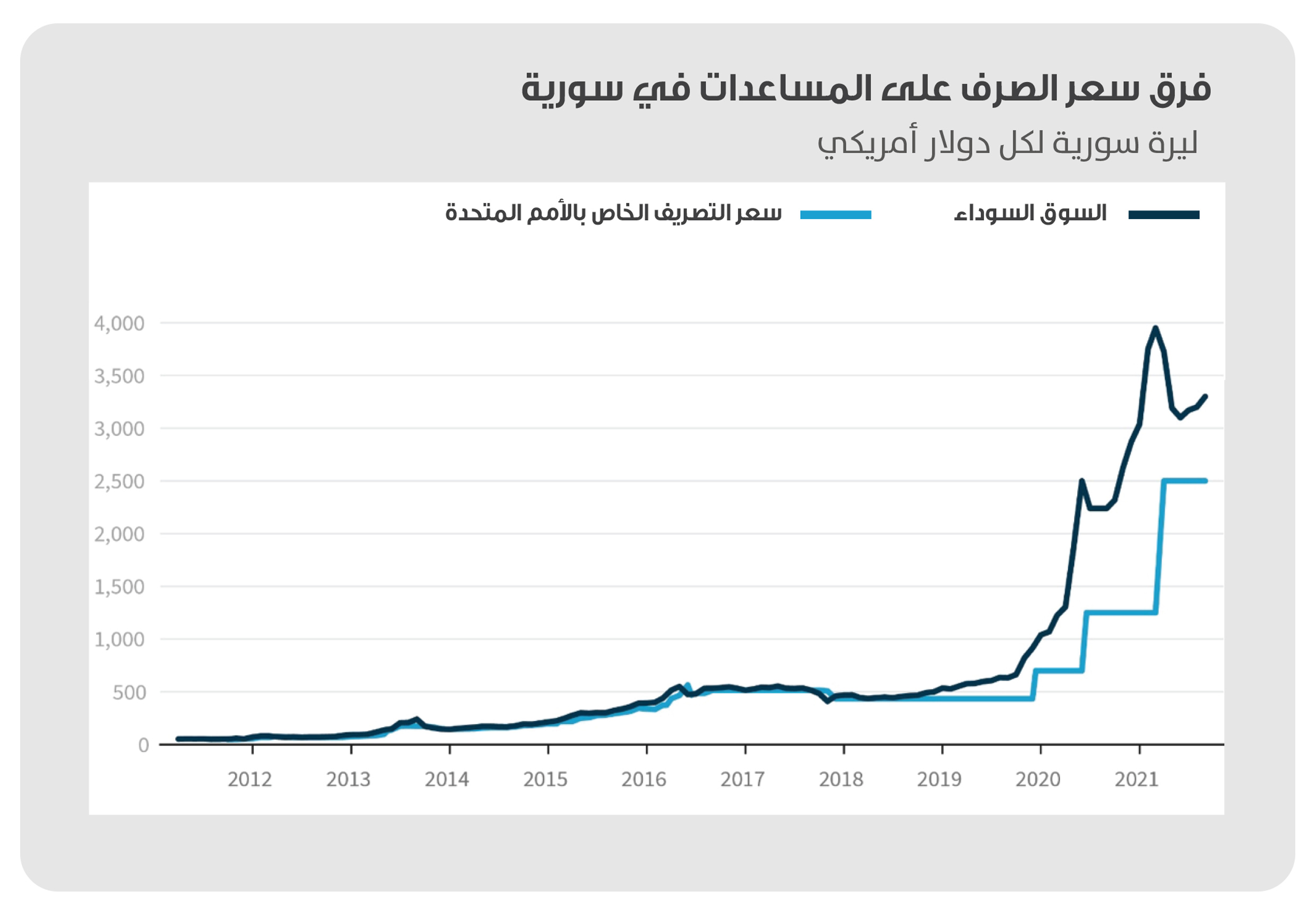 تقوم وكالات الأمم المتحدة بتحويل الأموال اللازمة لعملياتها إلى البنوك الخاصة العاملة في سورية أو عن طريق "البنوك المُراسِلة" في بلدان أخرى. وفي كِلتا الحالتين، تقوم تلك الوكالات بتصريف العملة الأجنبية (الدولار الأمريكي عادة) إلى الليرة السورية بسعر يحدده مصرف سورية المركزي. وغالباً ما يكون هذا السعرُ أقلَّ بكثير من السعر الذي يحدده العرض والطلب كما هو مبيَّن في السوق السوداء (انظر الرسم البياني أدناه).