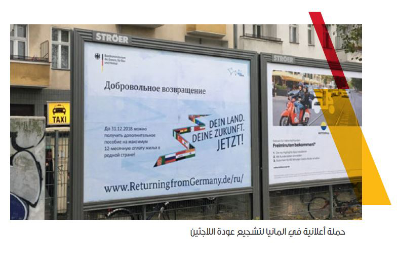 وقد قامت بعض الدول الأوروبية باعتماد حوافز للاجئين الراغبين بالعودة الطوعية إلى بلادهم. على سبيل المثال، اعتمدت ألمانيا في عام 2018 نظاماً للحوافز، يتضمّن تقديم مبلغ مالي يصل إلى 1000 يورو للشخص العائد و3000 يورو للعائلة(18)