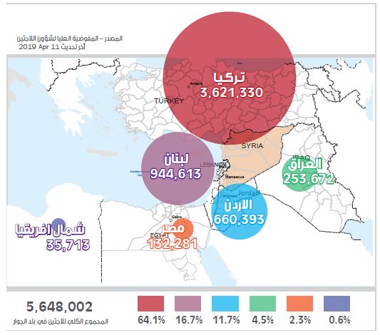 أعداد اللاجئين السوريين المسجلين حسب بلد اللجوء
