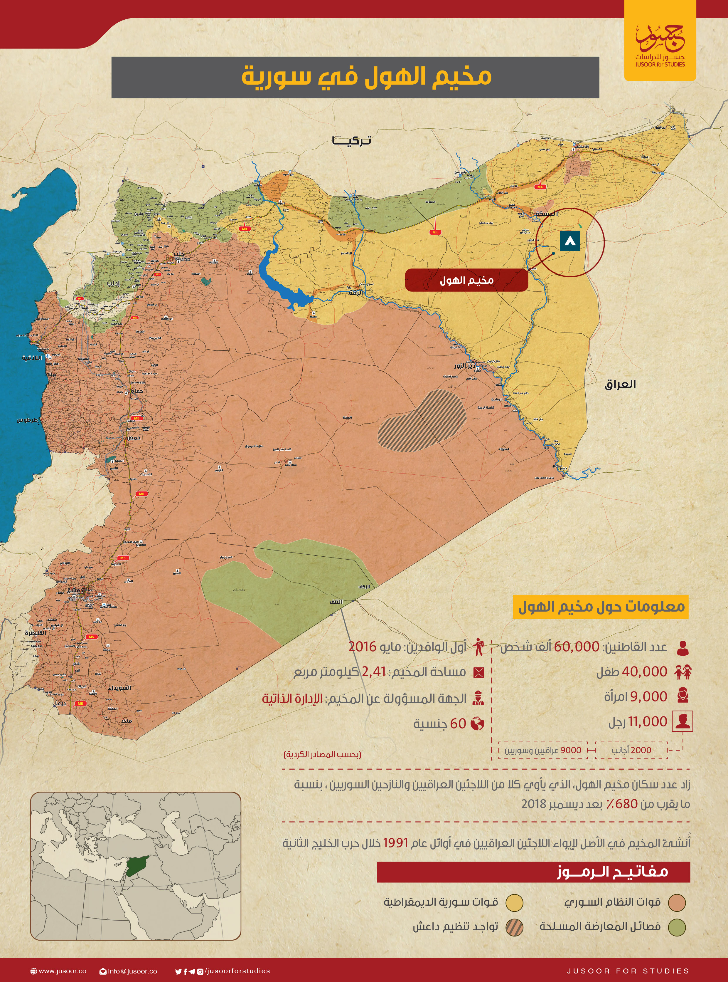 يُقدّر عدد الذين يعيشون في مخيم الهول بحوالي 60 ألف شخص(7)، بينهم نحو 40 ألف طفل من ستين جنسية(8)