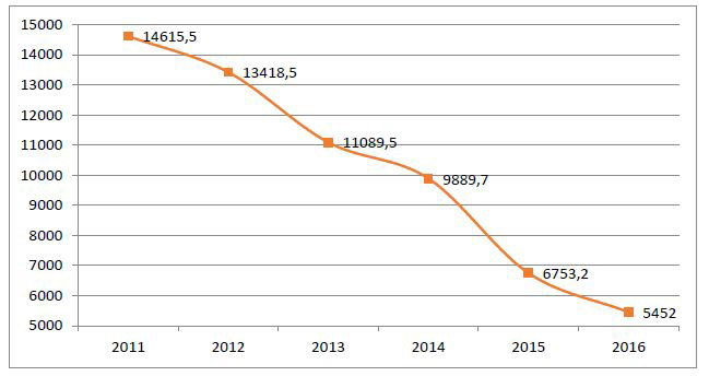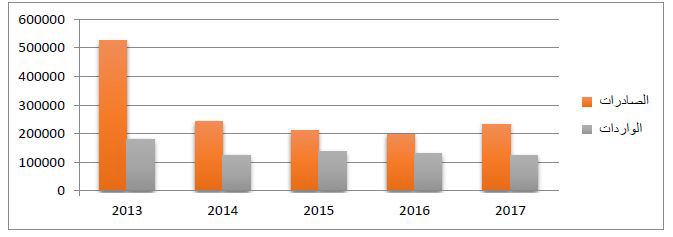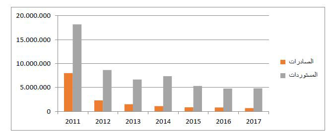 حجم الصادرات والواردات السورية في الفترة 2011–2017 (ألف دولار)