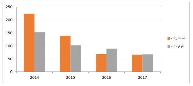 كما انخفضت الواردات الأردنية الإجمالية من مليار و628 مليون دينار إلى مليار و372 مليون دينار بحسب الأرقام الواردة من دائرة الإحصاءات العامة الأردنية(7) . ويَظهر هذا الهبوط وارتباطه بما حصل في معبر نصيب بوضوح أكثر عند معاينة حركة التجارة بين الأردن وسورية، حيث تُظهر بيانات منظمة التجارة الدولية تراجع الصادرات الأردنية إلى سورية من 223 مليون دولار عام 2014 إلى نحو 65 مليون دولار في عام 2017، أي أنها انخفضت بنسبة 70% بين 2014-2017. وتراجع حركة المستوردات من الأردن إلى سورية من 452 مليون دولار في 2014 إلى 66 مليون دولار في عام 2017، أي بنسبة انخفاض وصلت إلى 56% (انظر الشكل رقم -3-).