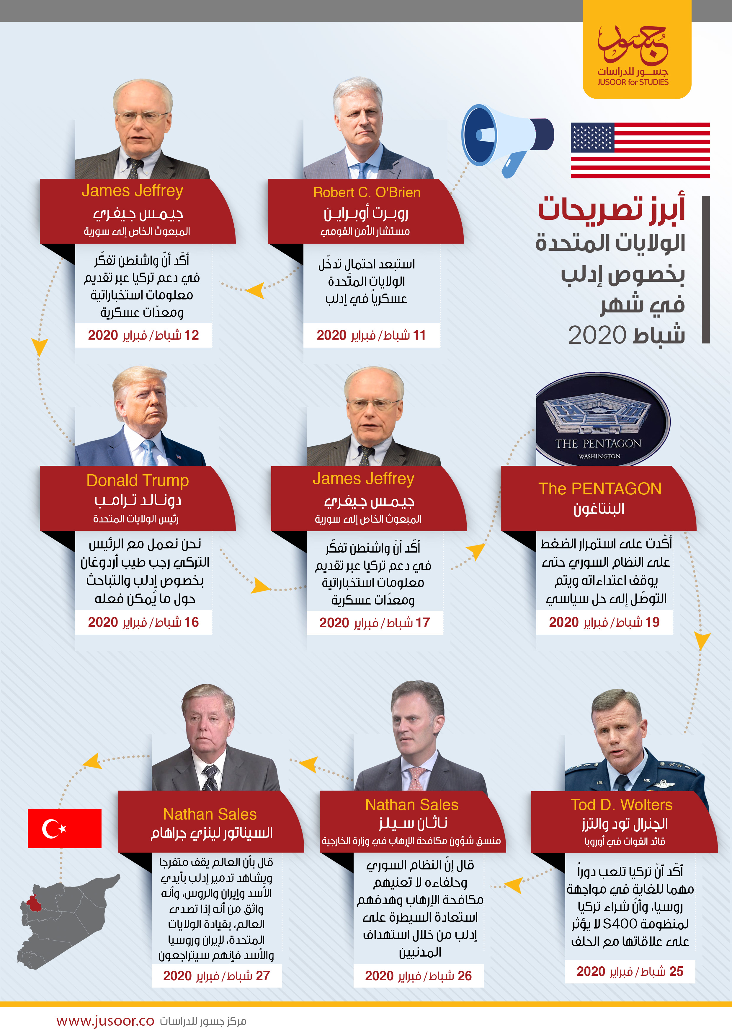 • في 12 شباط/ فبراير 2020، زار المبعوث الأمريكي الخاص إلى سورية جيمس جيفري أنقرة، وأجرى محادثات مع وزير الدفاع التركي خلوصي أكار حول التصعيد في محافظة إدلب ومحيطها. وقد تم التأكيد على الأهداف الجيوستراتيجية المشتركة بين تركيا والولايات المتّحدة في كل من سورية وليبيا، والدعم الذي تقدّمه بلاده للمصالح المشروعة لتركيا في إدلب، وعدم قبولها استهداف النظام السوري لنقاط المراقبة. كما قال إنّ واشنطن تفكّر في دعم تركيا عبر تقديم معلومات استخباراتية ومعدّات عسكرية.