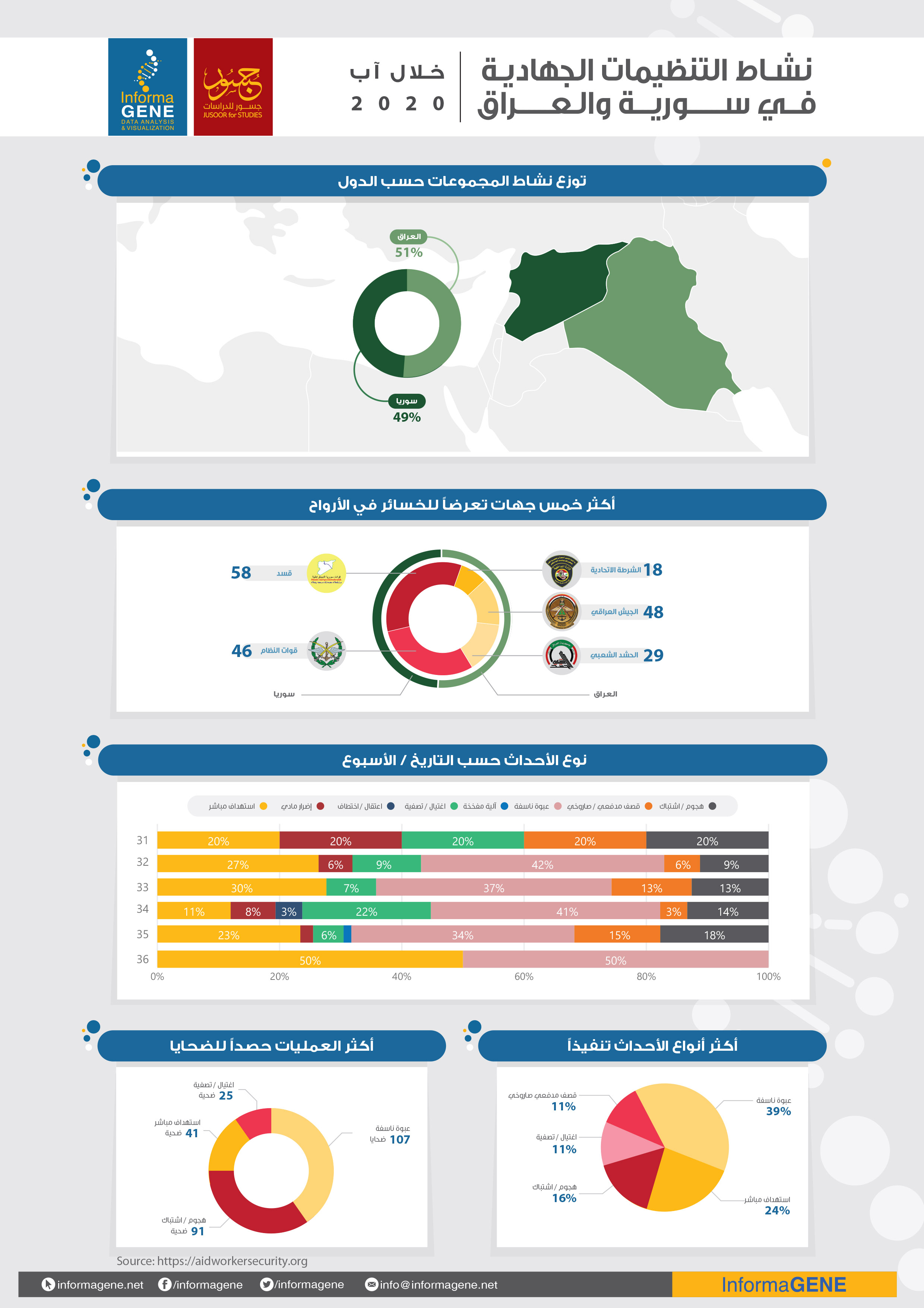 نفّذت التنظيمات الجهادية في سورية والعراق 200 عمليّة مختلفة خلال شهر آب/أغسطس، حيث قام تنظيم الدولة بـ 198 عمليّة منها، فيما قامت مجموعة تسمّي نفسها "كتائب خطّاب الشيشاني" بهجومين على الدوريات الروسية التركية المشتركة على الطريق الدولي M4.