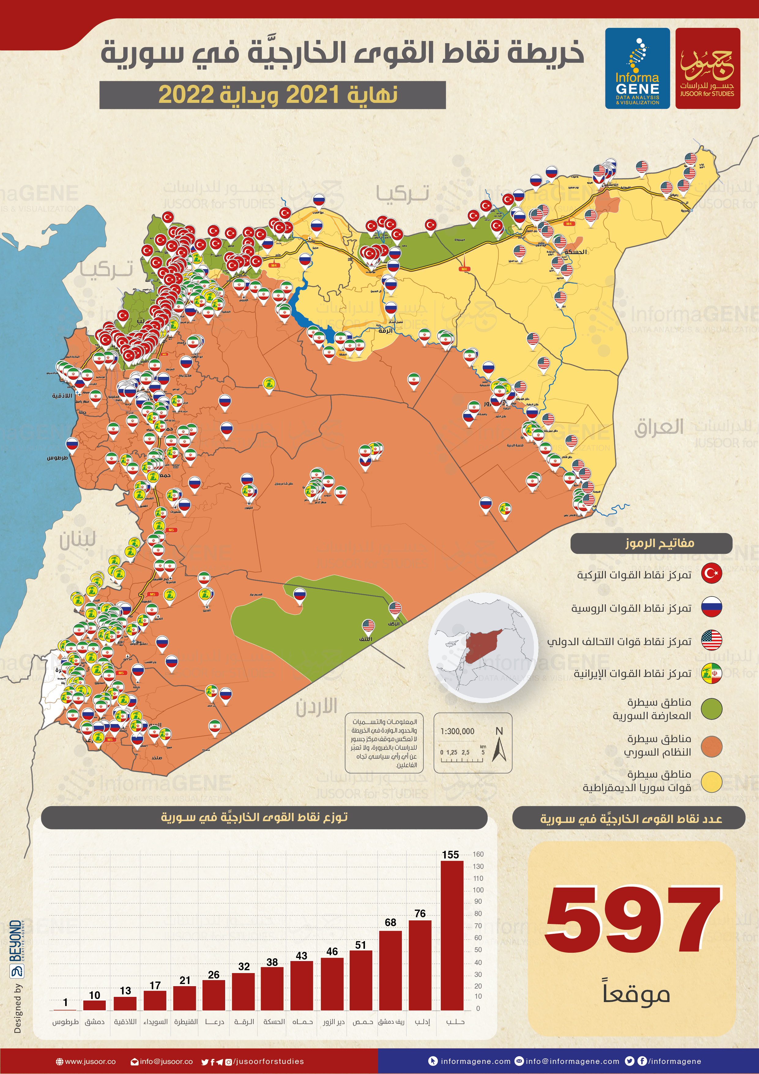 ينشر "مركز جسور للدراسات" بالتعاون مع "منصة إنفورماجين لتحليل البيانات" خرائط تحليلية حول النقاط الأمنية والعسكرية لمختلف القوى الخارجية المتدخلة عسكرياً وبشكل مباشر في سورية، حيث مع مطلع عام 2022 وصل عدد المواقع الأمنية والعسكريّة الأجنبيّة من قواعد ونقاط إلى ما يقارب 600 موقعاً، ويعكس هذا الرقم حجم التأثير الكبير للأطراف الخارجية في الملف السوري، على حساب التأثير الداخلي الضعيف للفاعلين المحليين جميعاً. وتشمل خريطة نقاط القوى الخارجية في سورية المواقع الأمنية والعسكرية لكل من التحالف الدولي الذي تقوده الولايات المتحدة، وتركيا، وروسيا، وإيران بما في ذلك تفصيل النقاط الإيرانية بين نقاط الحرس الثوري الإيراني ونقاط حزب الله اللبناني ونقاط مشتركة بينهما. ويحرص "مركز جسور للدراسات" بالتعاون مع "منصة إنفورماجين لتحليل البيانات" على تطوير خارطة المواقع الأجنبية في سورية، ليكون هذا الإصدار المشترك تحديثاً للنسخة التي تمَّ إصدارها مطلع عام 2021، ثم منتصف عام 2021، وذلك ضمن عملية رصد مستمرة لجميع التغييرات التي طرأت على هذه المواقع وطبيعة القوات المنتشرة فيها وأعدادها وعتادها ومهامها. ويُلاحَظ في الإصدار الجديد لخارطة المواقع الأجنبية في سورية وجود تغيُّر في عدد القواعد والنقاط عند جميع القوى دون استثناء؛ حيث تراجَع حضور التحالف الدولي، وازداد بالمقابل الحضور التركي بشكل بسيط نسبيّاً والروسي بشكل أكبر، أمّا الحضور الإيراني فقد كان له الحصّة الأكبر من الزيادة في عدد المواقع خلال عام 2021. وحتَّى مطلع عام 2022 بلغ عدد القواعد العسكريّة والأمنيّة والعمليّاتيّة الأجنبية في سورية 138 قاعدة، وعدد النقاط العسكريّة والأمنيّة واللوجستيّة ونقاط المراقبة 459 نقطة. وتوزيع هذه النقاط على الفاعلين الخارجيين كان كالتالي: - قوات التحالف الدولي الذي تقوده الولايات المتحدة: 28 موقعاً - القوات التركية: 122 موقعاً - القوات الروسية: 114 موقعاً - القوات الإيرانية: 333 موقعاً وتشير خريطة النقاط الإيرانية إلى 186 موقعاً للحرس الثوري الإيراني، و80 موقعاً لحزب الله اللبناني، و67 موقعاً مشتركاً بينهما. وينتشر في محافظة حلب العدد الأكبر من المواقع العسكريّة للقوّات الأجنبيّة في سورية بعدد يصل إلى 155 موقعاً عسكريّاً، تليها دمشق وريفها بـ 78 موقعاً، ومن ثَمَّ إدلب بـ 76 موقعاً، لتأتي بعدها محافظة حمص بـ 51 موقعاً، ودير الزور بـ 46 موقعاً، وحماة بـ 43 موقعاً، والحسكة بـ 38 موقعاً، والرقّة بـ 32 موقعاً، ودرعا بـ 26 موقعاً، والقنيطرة بـ 21 موقعاً، والسويداء بـ 17 موقعاً، واللاذقية بـ 13 موقعاً، وطرطوس بموقع واحد فقط. كما يقدّم "مركز جسور" و "منصّة إنفورماجين" مع هذه الخرائط رسوماً بيانيّة وقراءةً وخلاصة تحليليّة للوجود العسكريّ الأجنبيّ في سورية بطبيعته وأهدافه، لمساعدة المهتمّين بالقضيّة السوريّة من باحثين وخبراء وصنّاع قرار في رسم صورة أوضح للمشهد السوريّ المعقّد والمتداخل، وذلك للوصول لفهم أكبر لفرص التأثير أو التغيّر المستقبلي في هذا المشهد وفاعليه وأدواته.