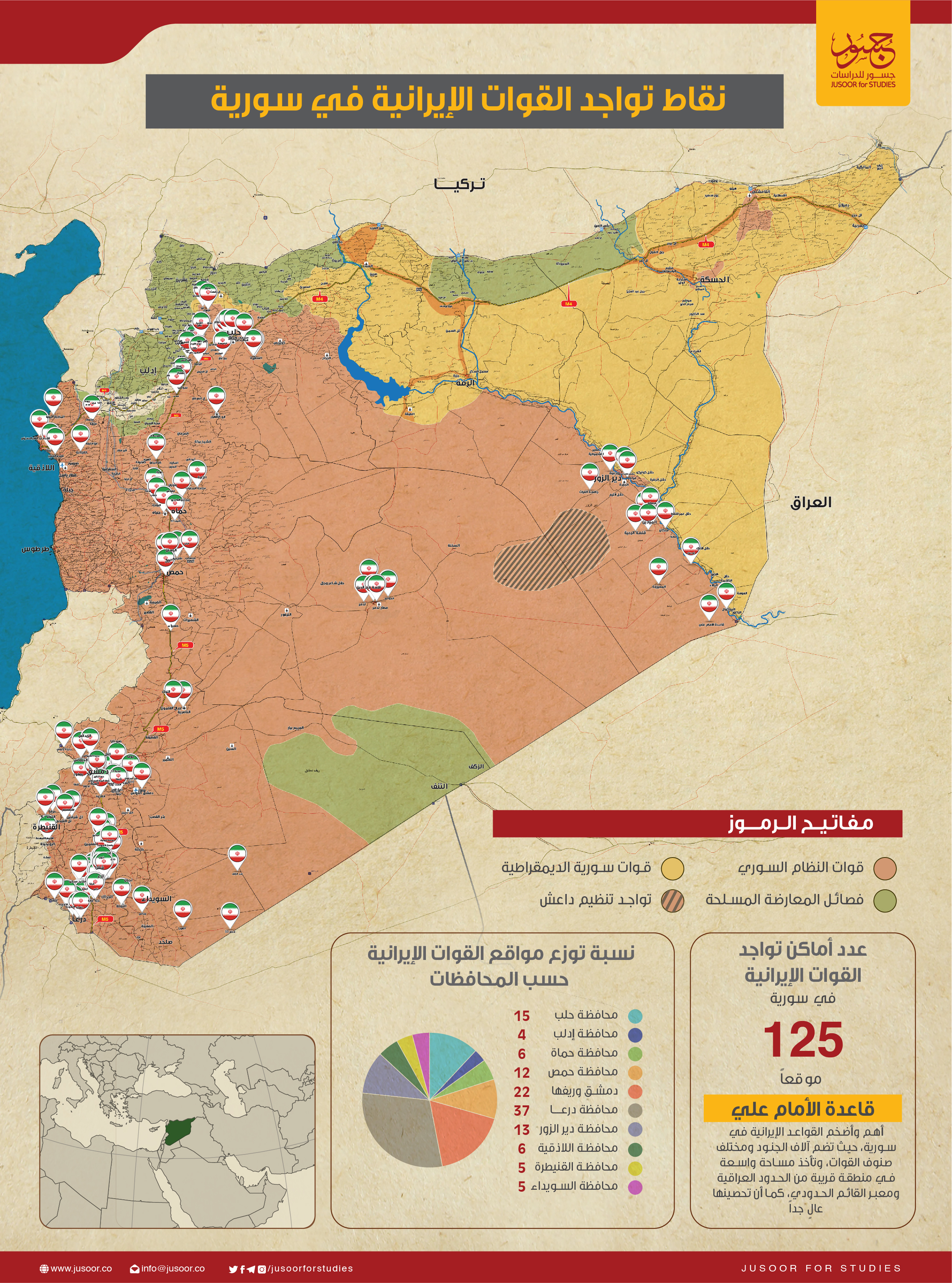 كما أصدر مركز جسور للدراسات في 1 آب/ أغسطس 2020، خريطة لقواعد ونقاط وجود القوات الإيرانية في سورية فقط وليست الميليشات التابعة لها، وقد شملت الخريطة 125 موقعًا، موزعة على 10 محافظات في مقدّمتها درعا بواقع 37 موقعًا وتليها دمشق وريفها بواقع 22 موقعًا ومن ثم حلب بواقع 15 موقعاً.