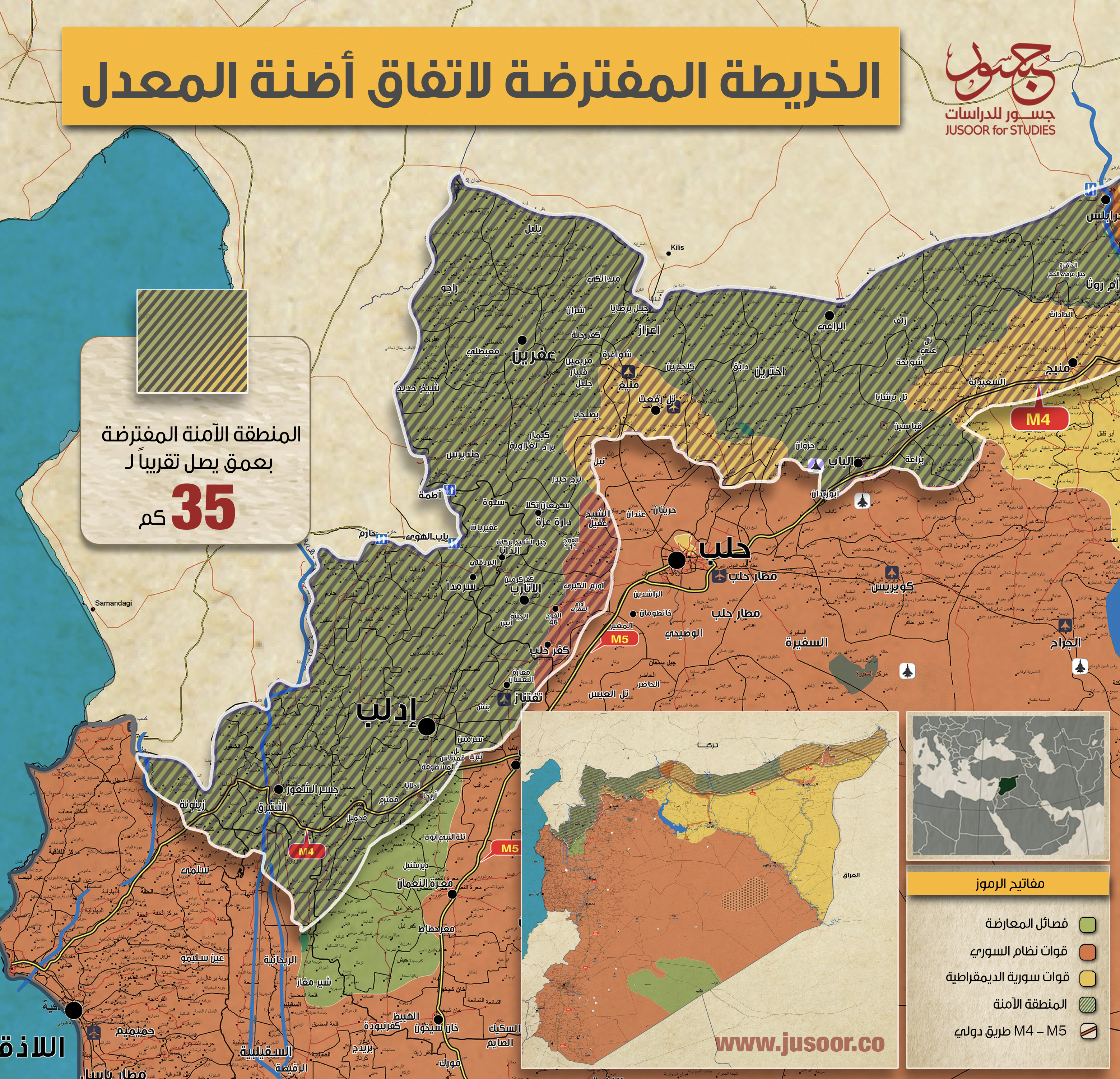 ويصل عمق المنطقة الآمنة المفترضة في الخريطة إلى 35 كم، والذي قد يزيد أو ينقص في بعض المناطق، في حال غياب القدرة أو الرغبة على تغيير خطوط التماس التي تقدّم إليها النظام السوري في محافظة إدلب ومحيطها شمال غرب البلاد.