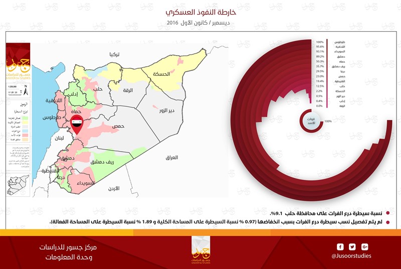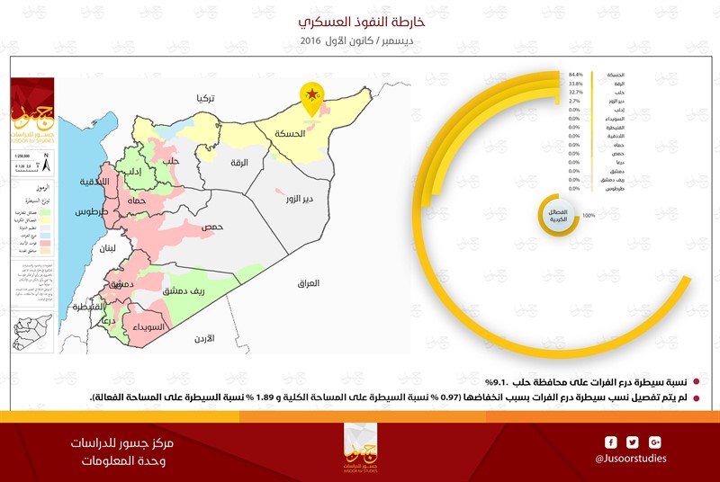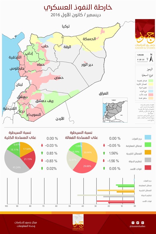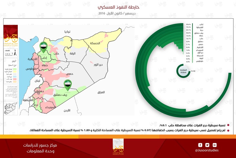 أصدر مركز جسور للدراسات خارطةَ النفوذ العسكري لشهر كانون الأول/ديسمبر 2016، والتي أظهرت بعض التغيرات في نسب السيطرة الكلية والفعّالة لمختلف الأطراف المتحاربة عن خارطة النفوذ العسكري لشهر تشرين الثاني/نوفمبر 2016.