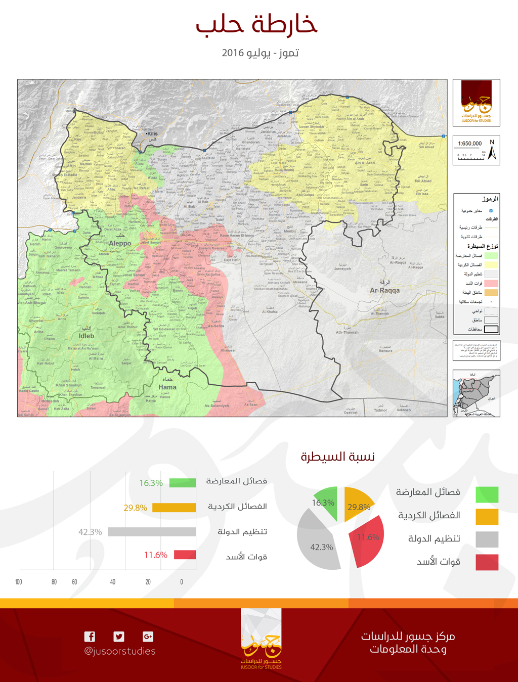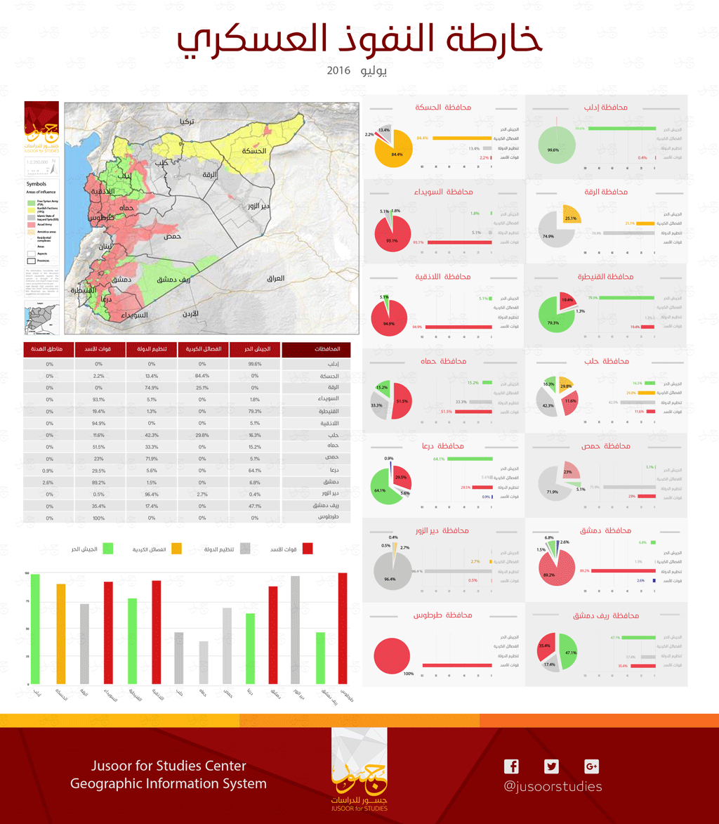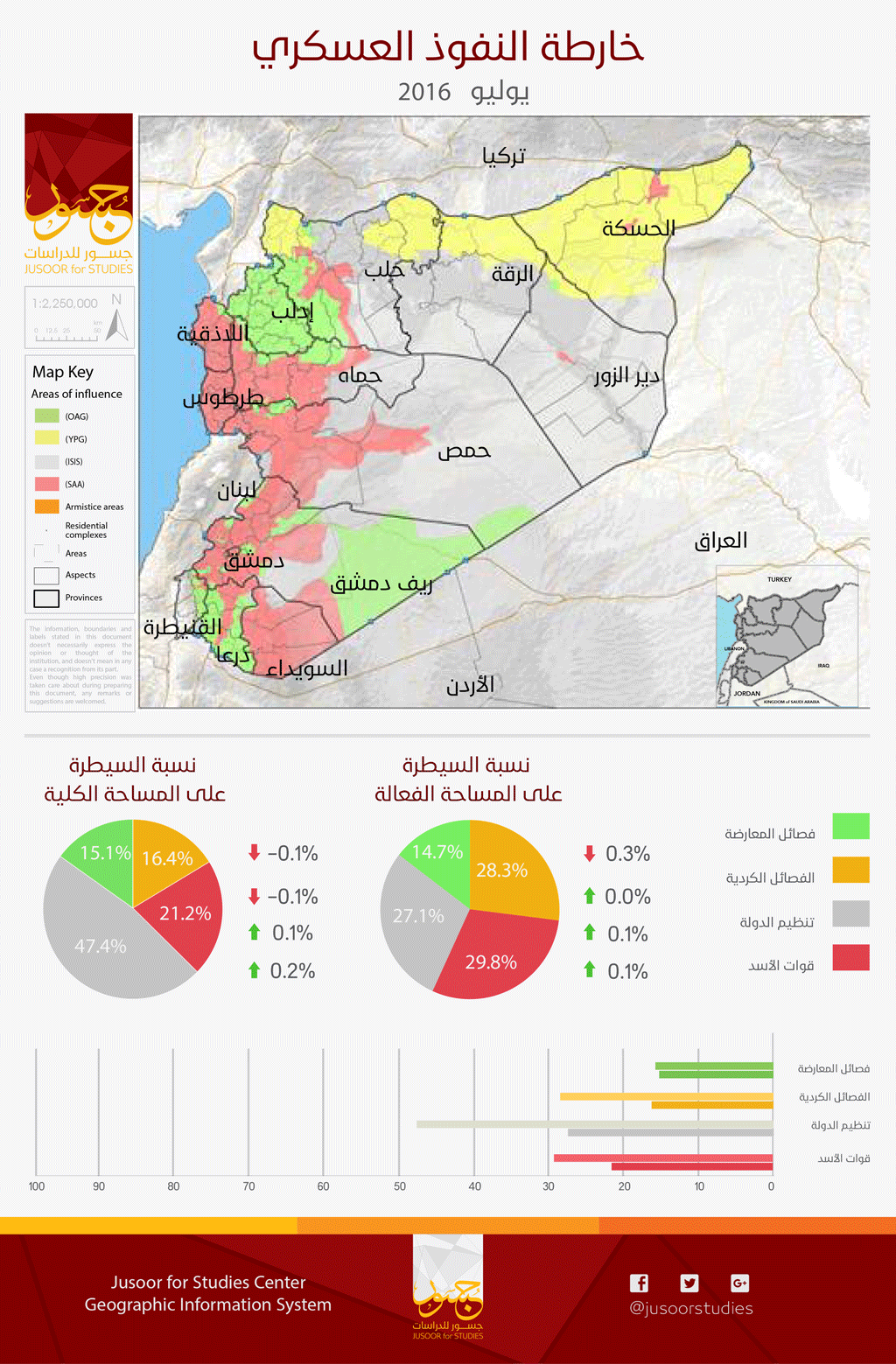 أصدر مركز جسور خارطة النفوذ العسكري لشهر تموز/يوليو 2016، والتي أظهرت بعض التغيرات في نسب السيطرة الكلية والفعّالة لمختلف الأطراف المتحاربة عن خارطة النفوذ العسكري لشهر حزيران/يونيو 2016.