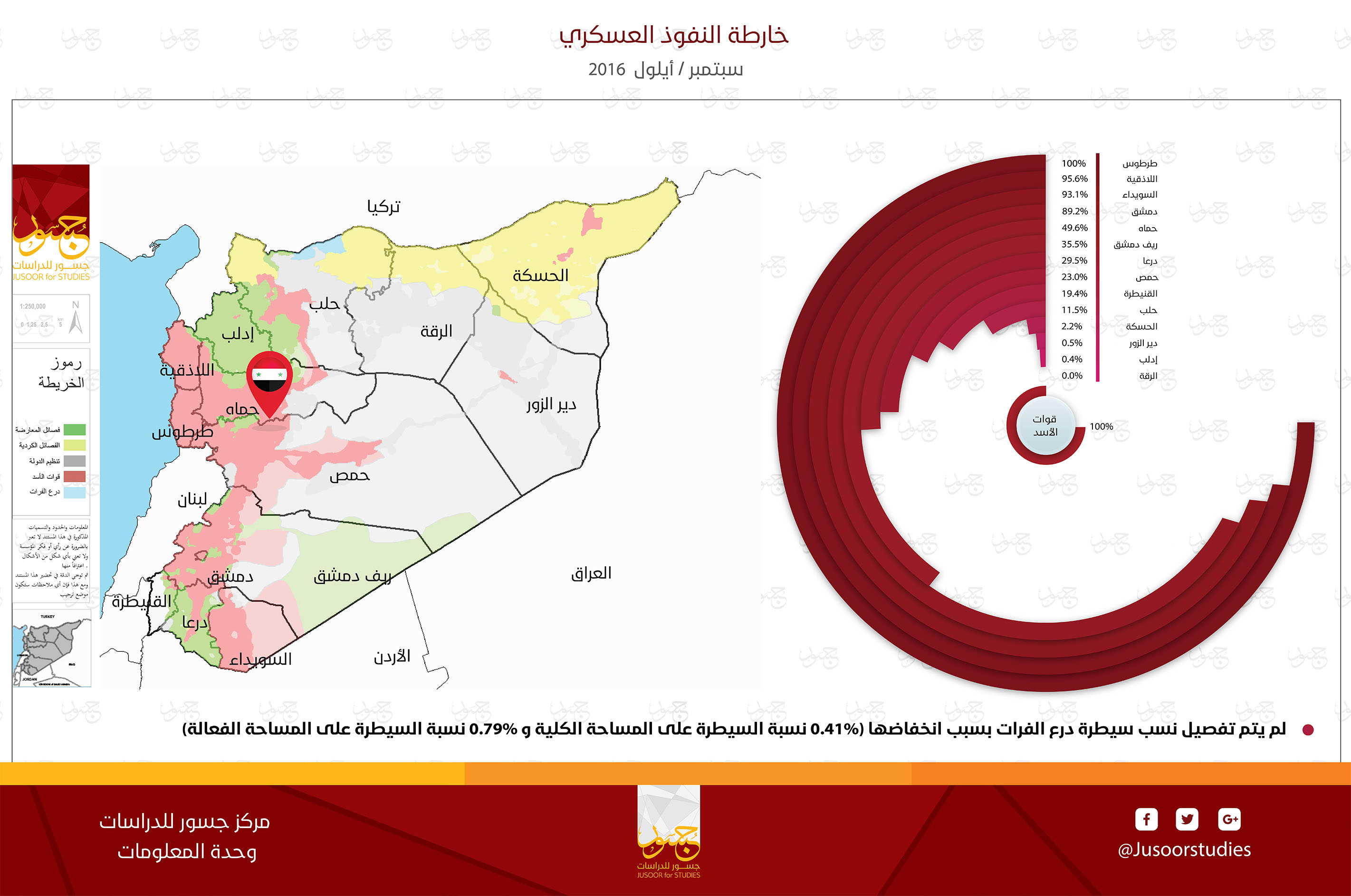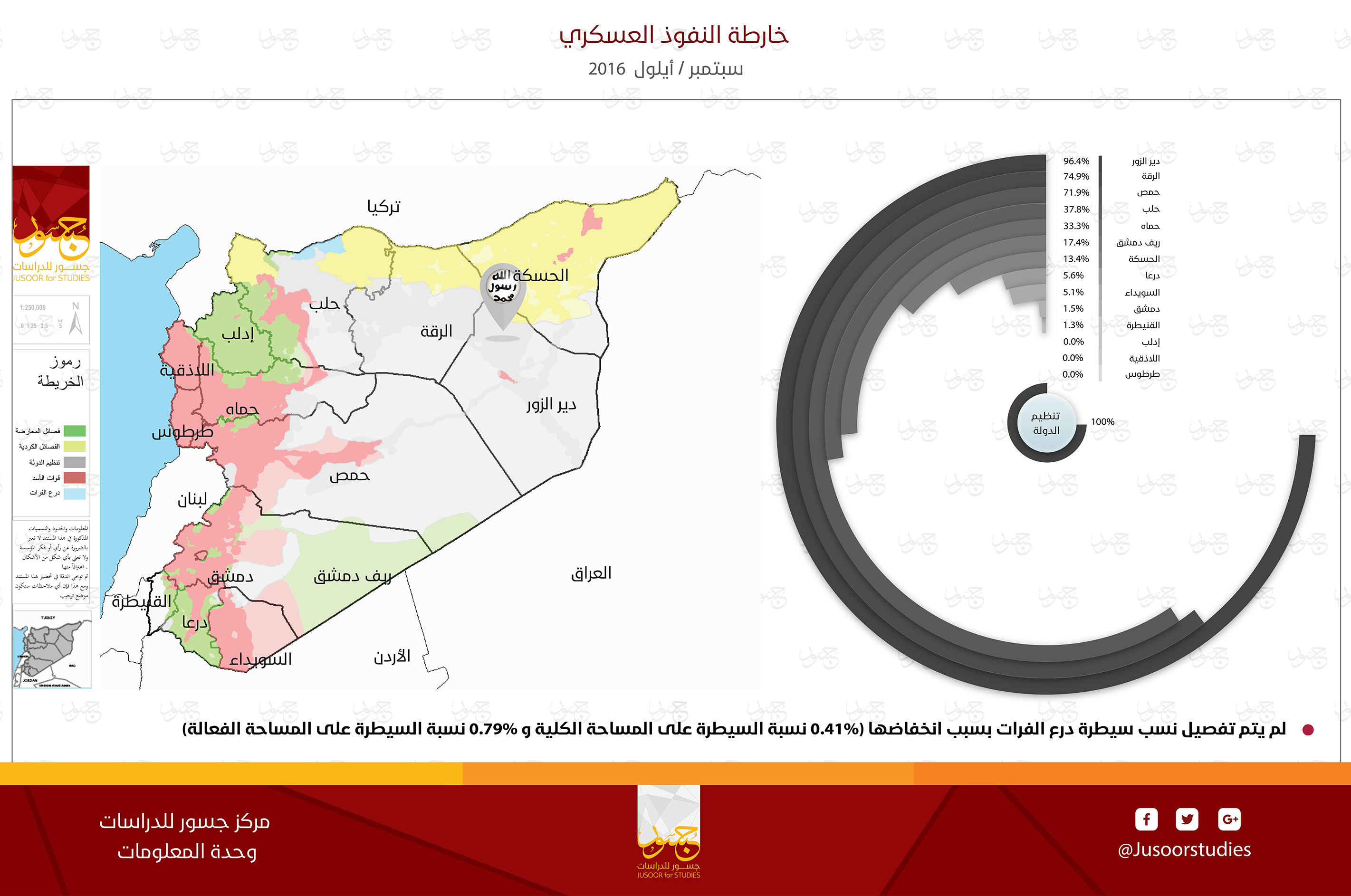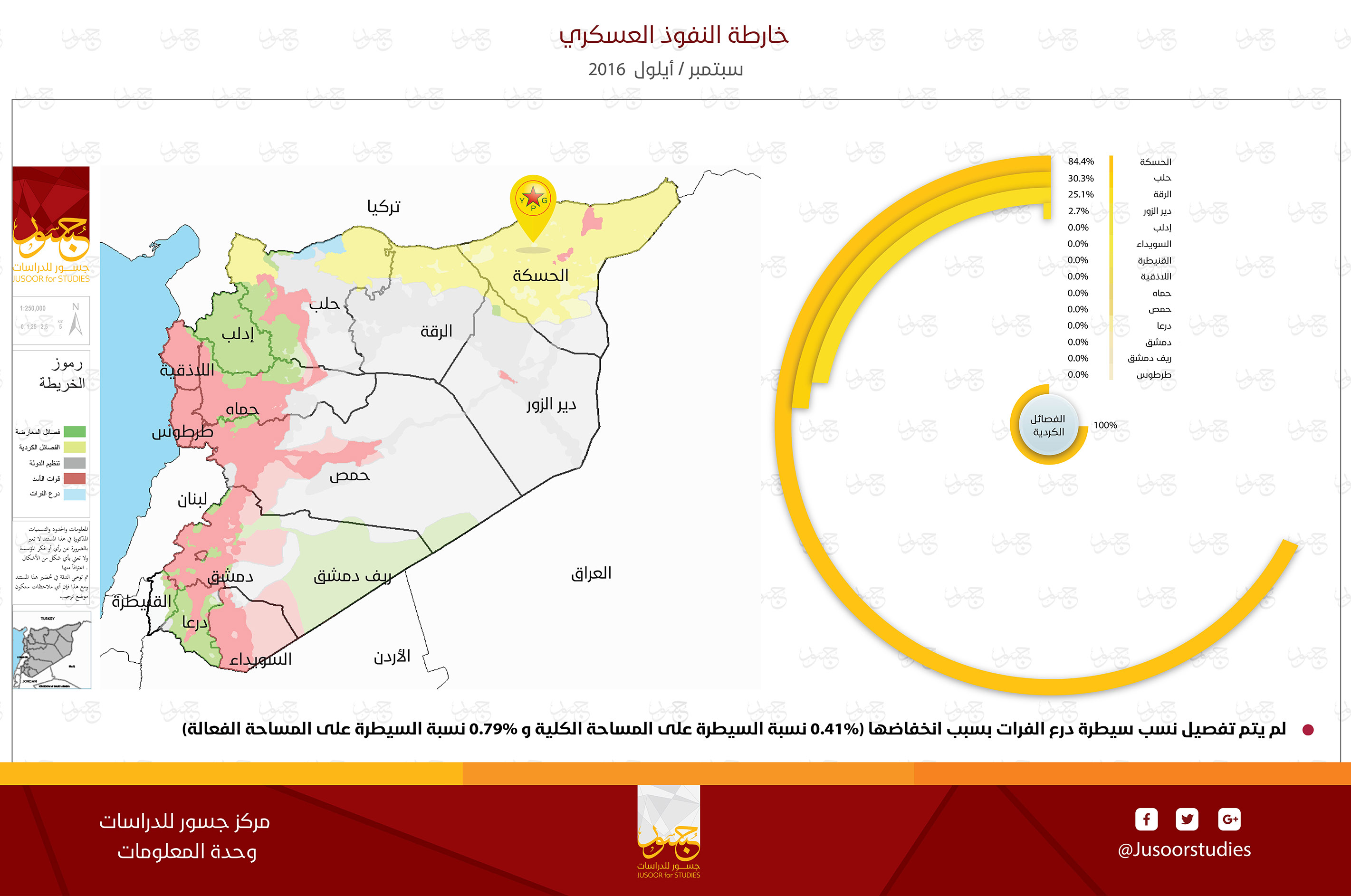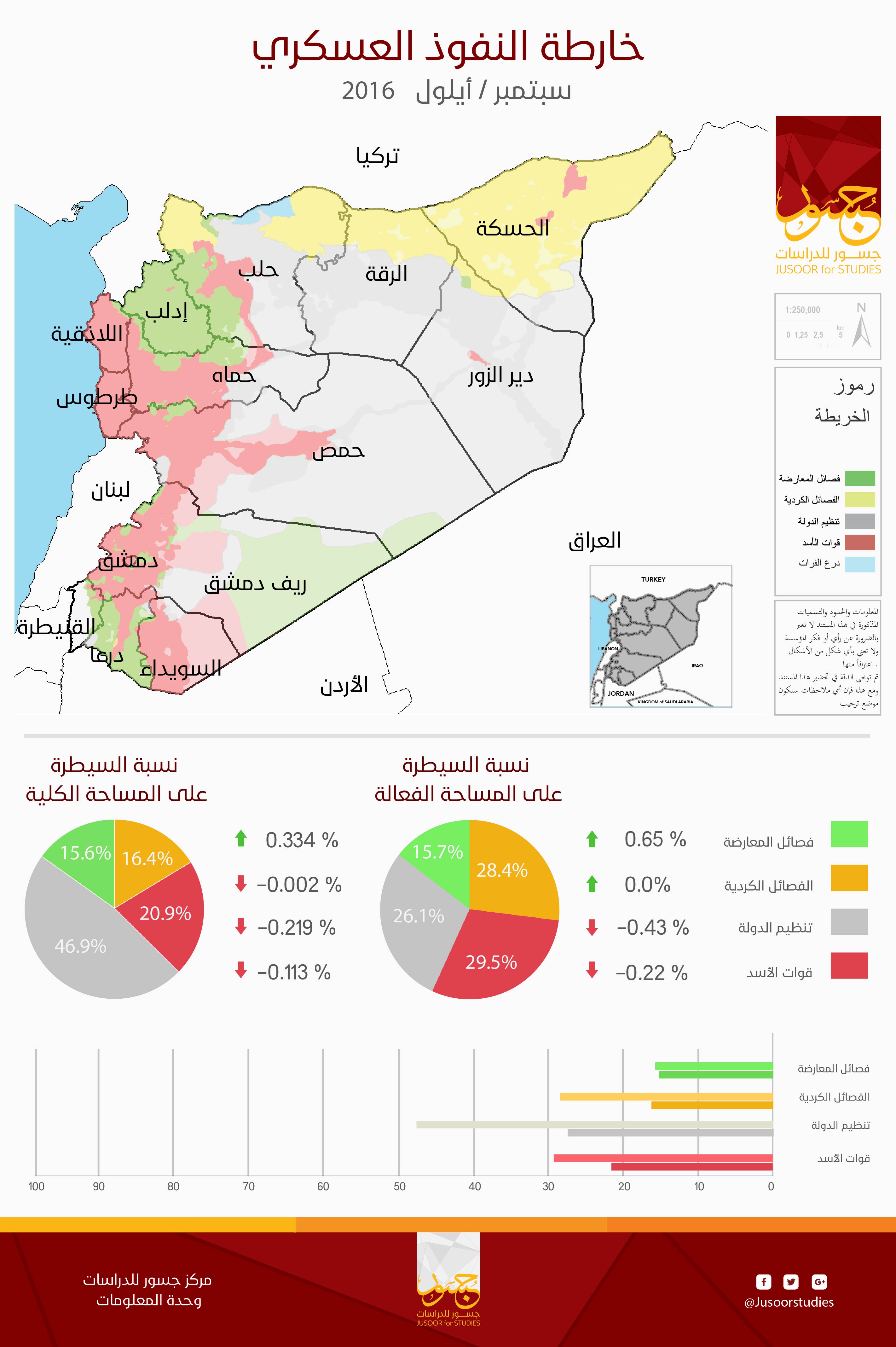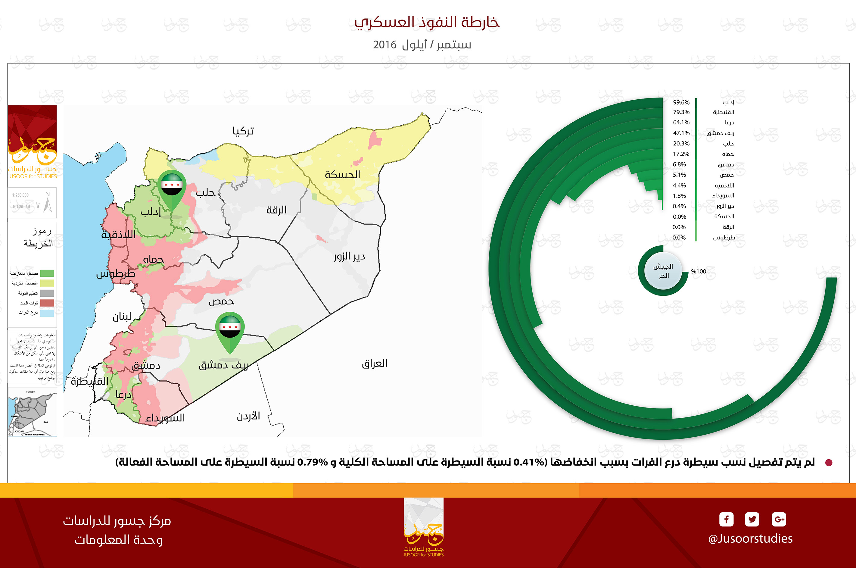 أصدر مركز جسور خارطة النفوذ العسكري لشهر أيلول/سبتمبر 2016، والتي أظهرت بعض التغيرات في نسب السيطرة الكلية والفعّالة لمختلف الأطراف المتحاربة عن خارطة النفوذ العسكري لشهر آب/أغسطس 2016.