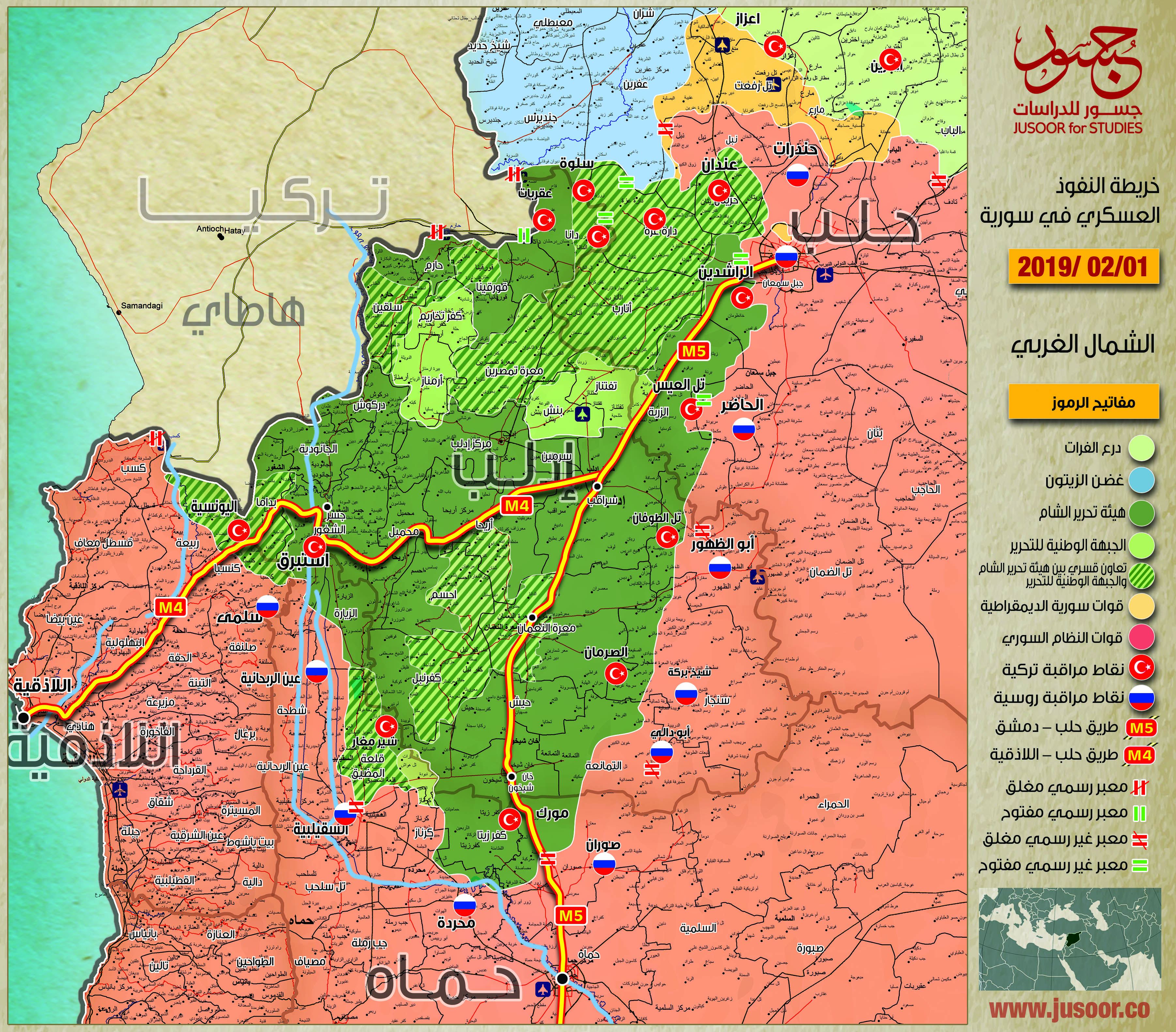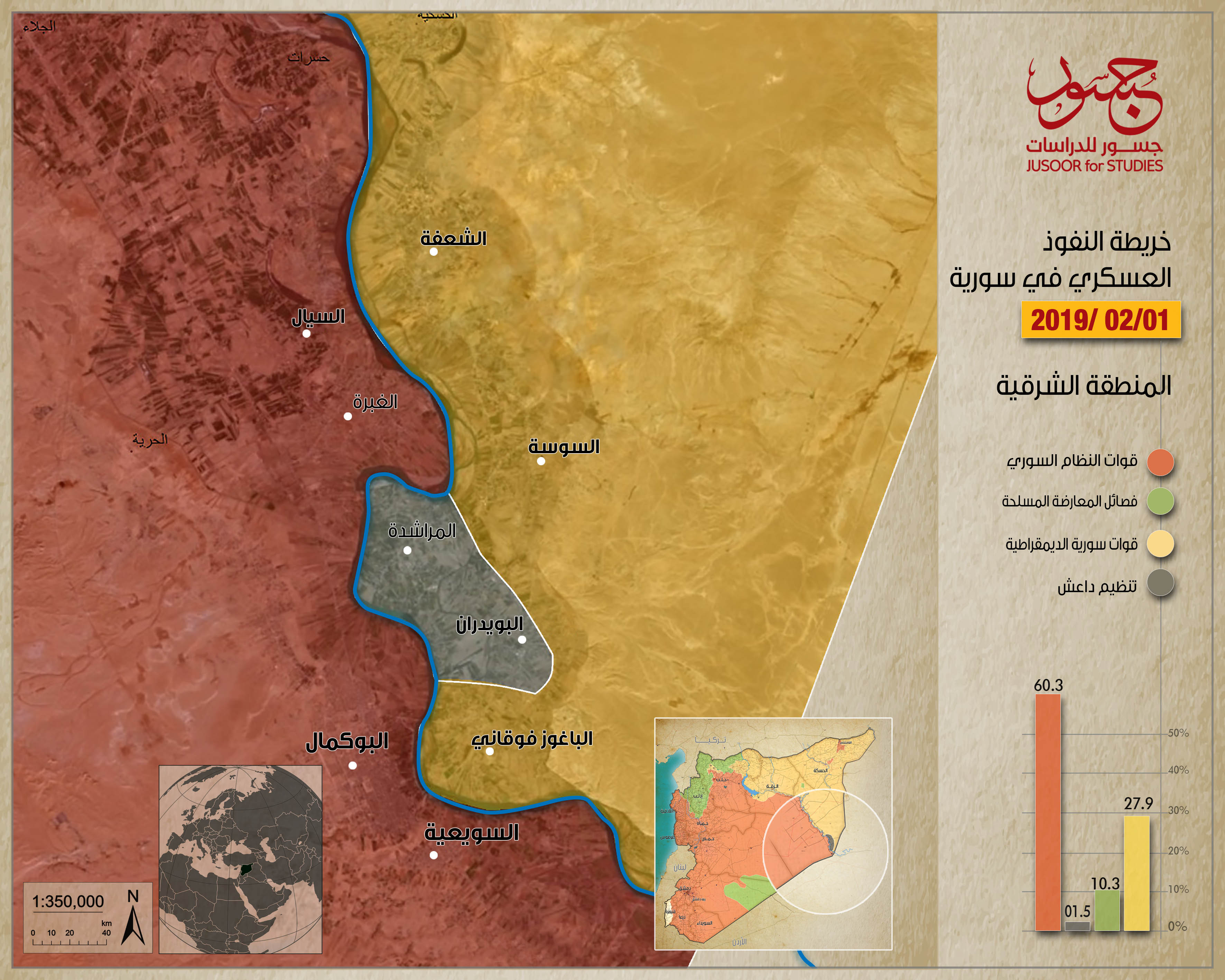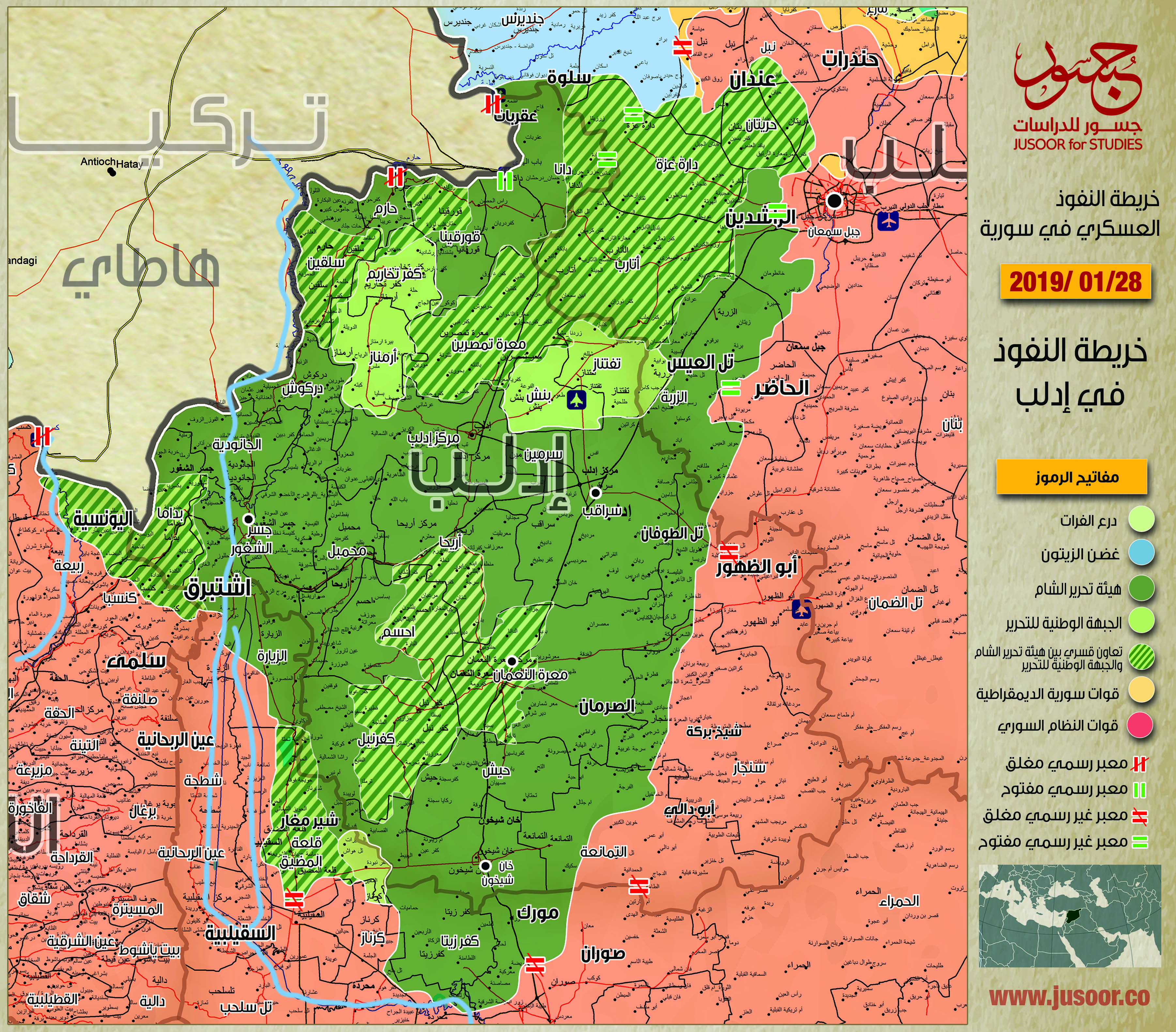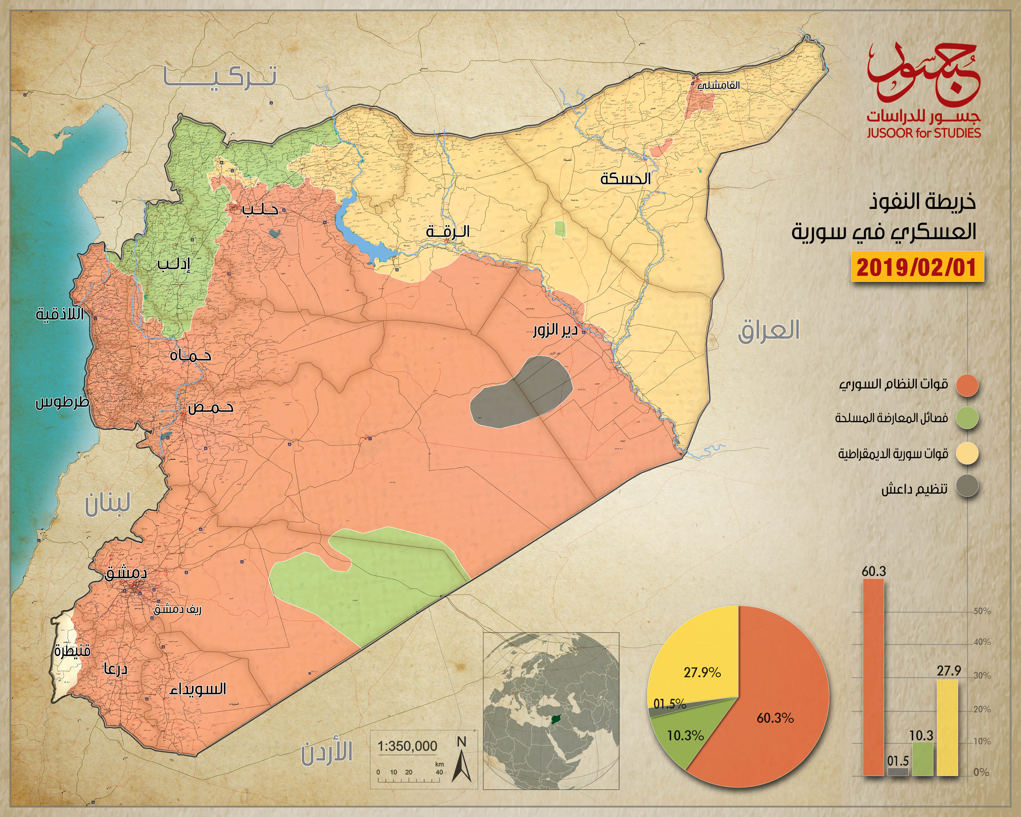 أظهرت خريطة النفوذ العسكري في سورية لشهر كانون الثاني/ يناير 2019 تغيراً طفيفاً في نسب السيطرة الكلية بين أغلب القوى المتصارعة، مقارنة مع النسب التي تم تسجيلها في نهاية عام 2018. وقد شهد هذا الشهر بعض الأحداث البارزة، حيث سيطرت قوات سوريا الديمقراطية على مزيد من القرى في جيب هجين، آخر معاقل تنظيم داعش شرق الفرات، وبدورها سيطرت "هيئة تحرير الشام" على كامل مصادر القوة والثروة في الشمال السوري على حساب فصائل "الجبهة الوطنية للتحرير".