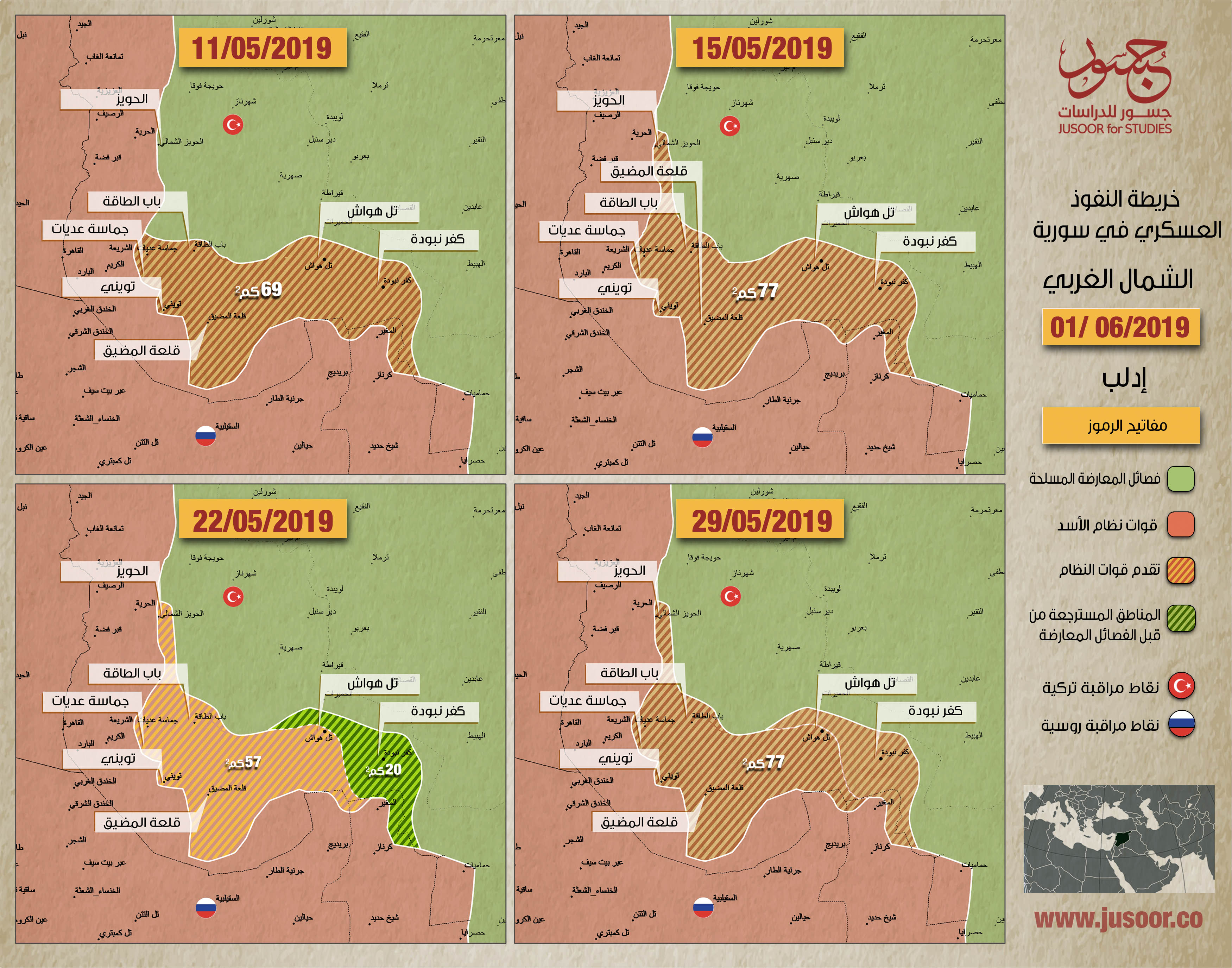 تعرّضت خارطة النفوذ والسيطرة شمال سوريا إلى تعديل طفيف في نسب السيطرة نتيجة الحملة العسكرية المستمرة التي بدأها النظام السوري بإسناد جوي روسي مُكثّف في 6 أيار/ مايو 2019، والتي سبقها تمهيد ناري كثيف استمرّ لعدّة أسابيع.