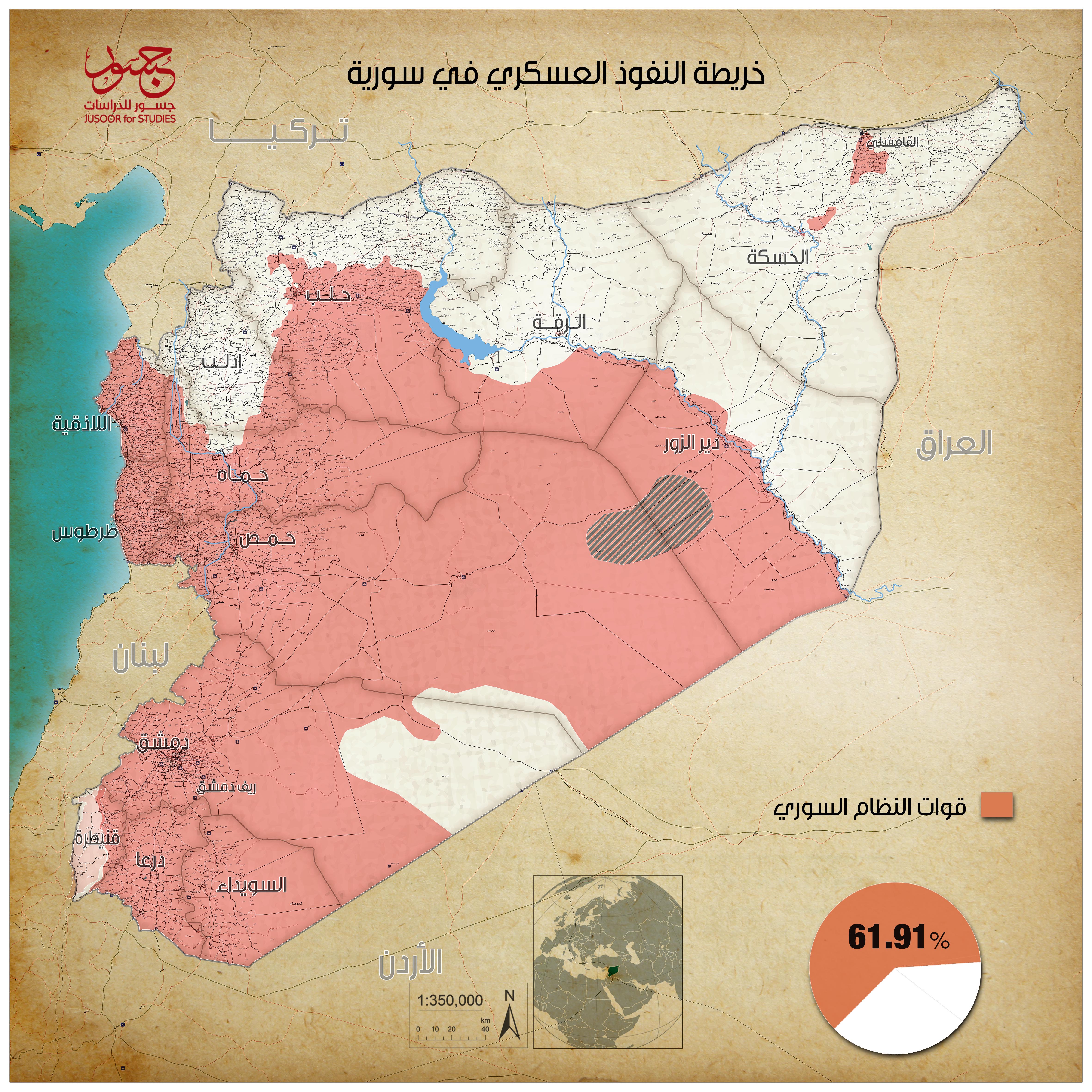 ووفقاً للخريطة التي يصدرها مركز جسور للدراسات شهرياً فإنّ نسبة سيطرة النظام السوري على الأرض أصبحت (61.91%) مقارنة مع نسبة (61.88%) التي تم تسجيلها في الشهر الفائت. وجاءت هذه الزيادة الطفيفة في قسم منها على حساب نسبة فصائل المعارضة التي باتت تُسيطر على (10.25%) من الأرض السورية، مقارنة مع نسبة (10.30%) التي كانت تسيطر عليها منذ شهر آب/ أغسطس 2018.