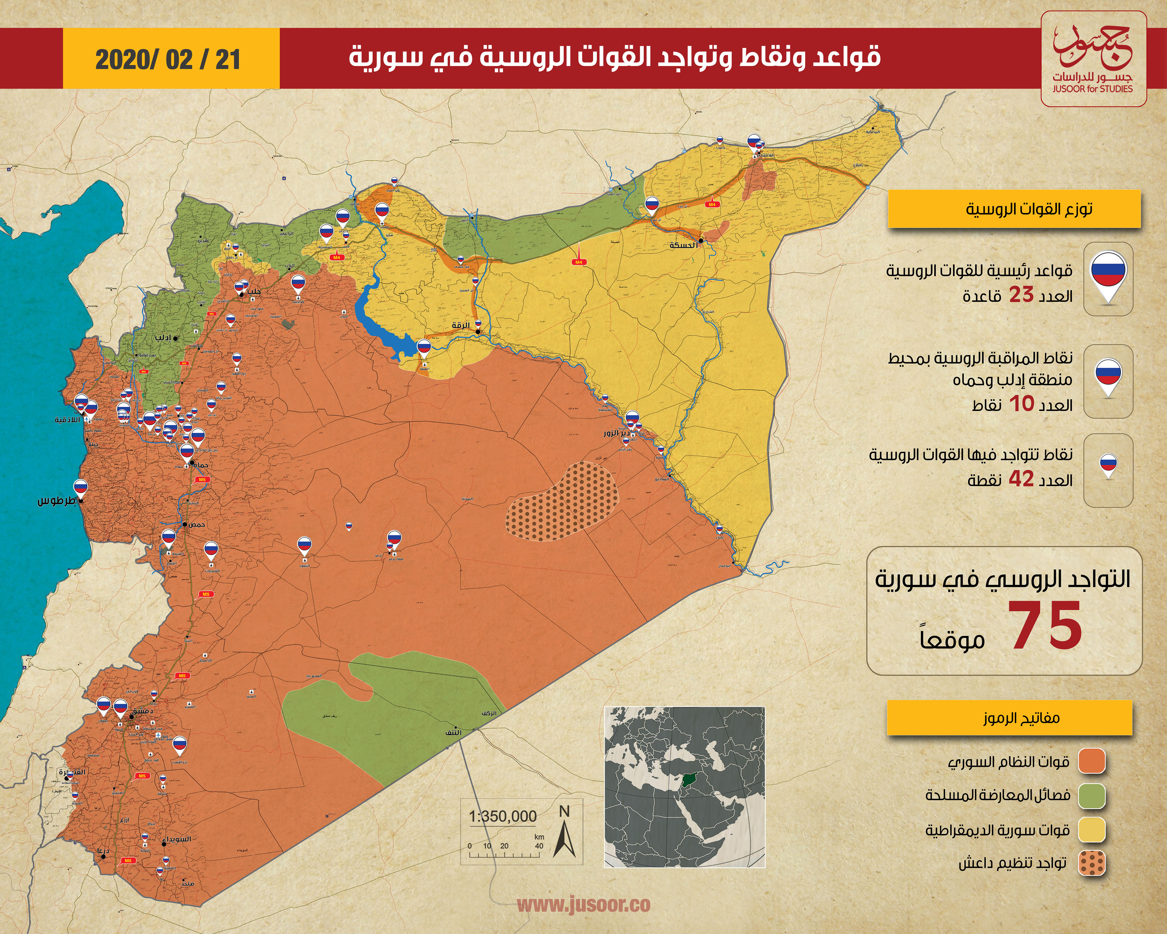أصدر مركز جسور للدراسات في 21 شباط/ فبراير 2020، خريطة لقواعد ونقاط تواجد روسيا في سورية. وشملت الخريطة 75 موقعاً، منها 23 قاعدة عسكرية، و42 نقطة تواجد، و10 نقاط مراقبة.