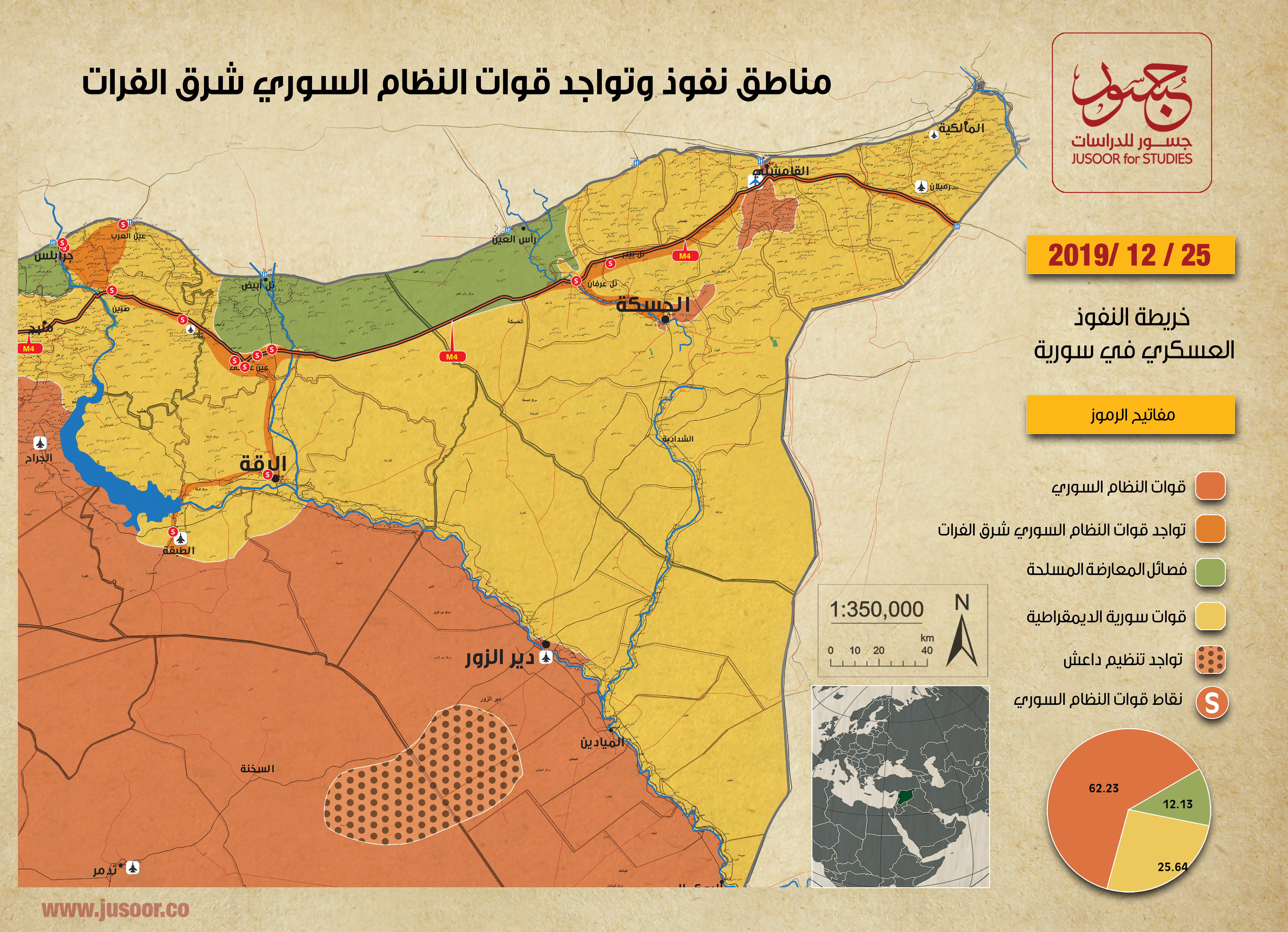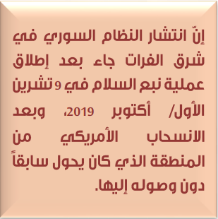 وحتى نهاية 2019، استطاعت قوات النظام السوري إقامة حوالي 20 نقطة عسكرية في المنطقة الآمنة شرق الفرات، بموجب مذكّرة التفاهم مع قوات سورية الديمقراطية وبموجب مذكّرة سوتشي (2019) بين تركيا وروسيا. لكنّ ذلك لا يعكس توسيعاً لنطاق السيطرة والنفوذ شرق الفرات بقدر ما هو محاولة لتحقيق وصول أكبر في المنطقة على أمل تعزيزه مستقبلاً.  في الواقع، إنّ انتشار النظام السوري في شرق الفرات جاء بعد إطلاق عملية نبع السلام في 9 تشرين الأول/ أكتوبر 2019، وبعد الانسحاب الأمريكي من المنطقة الذي كان يحول سابقاً دون وصوله إليها.