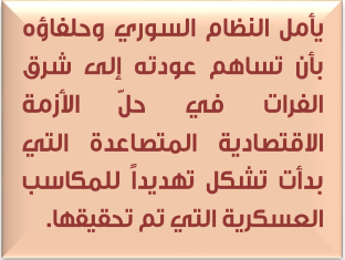 في الواقع، إنّ عودة النظام السوري إلى شرق الفرات لم تكن لتتحقّق لولا استعادة سيطرته على معظم مناطق غرب الفرات باستثناء مناطق عمليات تركيا ومنطقة خفض التصعيد شمال غرب البلاد. وغالباً ما يأمل النظام السوري وحلفاؤه بأن تساهم عودته إلى شرق الفرات في حل الأزمة الاقتصادية المتصاعدة التي بدأت تشكل تهديداً للمكاسب العسكرية التي تم تحقيقها، لا سيما في ظل السياسة الغربية المتشدّدة إزاءه وعدم قدرة الدبلوماسية الروسية في إعادة تنشيط الحركة التجارية.