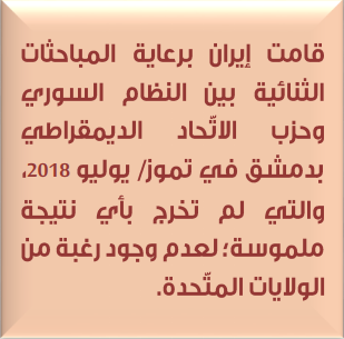 ويبدو أنّ إيران سارعت بعد إعلان الرئيس الأمريكي دونالد ترامب عن عزمه على انسحاب قوات بلاده من سورية، للاستثمار في الملف الكردي، مستفيدة من حالة الاتصال الإيجابي التي حققتها مع حزب العمال الكردستاني وفرعه السوري منذ عام 2012، على أمل أن يؤدي ذلك إلى عودة شرق الفرات إلى سلطة وسيادة النظام السوري، وبناءً عليه قامت إيران برعاية المباحثات الثنائية بين النظام السوري وحزب الاتّحاد الديمقراطي بدمشق في تموز/ يوليو 2018، والتي لم تخرج بأي نتيجة ملموسة؛ لعدم وجود رغبة من الولايات المتّحدة. وجرت لاحقاً لقاءات ثنائية غير معلنة بين الطرفين في دمشق.
