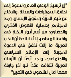 إن ترسيخ الوعي العام والدعوة إلى تحقيق الديمقراطية والعدالة، والدفاع عن قيم الحرّيّة وحقوق الإنسان، وربط المجتمع بعمليّة النهوض الفكري والحضاري؛ من أهم أدوار النخبةِ في واقعنا المعاصر، إلا أننا نلاحظ أن النخب العربية ما زالت تخفق في الدعوة المجرّدة إلى الإصلاح السياسي والاجتماعي، ونجد أيضًا أن الأزمات العربية تتفاقم عقداً تلو آخر جارفة معها آمال الشعوب في التغيير.