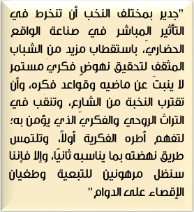 جدير بمختلف النخب أن تنخرط في التأثير المباشر في صناعة الواقع الحضاريّ، باستقطاب مزيد من الشباب المثقف لتحقيق نهوضٍ فكريٍّ مستمرّ لا ينبتُّ عن ماضيه وقواعد فكره، وأن تقترب النخبة من الشارع، وتنقّب في التراث الروحي والفكريّ الذي يؤمن به؛ لتفهم أطره الفكرية أولاً، وتلتمس طريق نهضته بما يناسبه ثانيًا، وإلا فإننا سنظل مرهونين للتبعية وطغيان الإقصاء على الدوام.