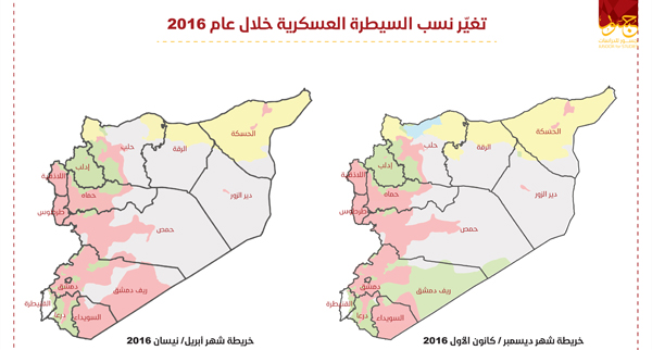 Jusoor for Studies issued the military influence map for December  2016, which showed that the ratio of total and effective controlling of areas by various fighting parties were different from th...