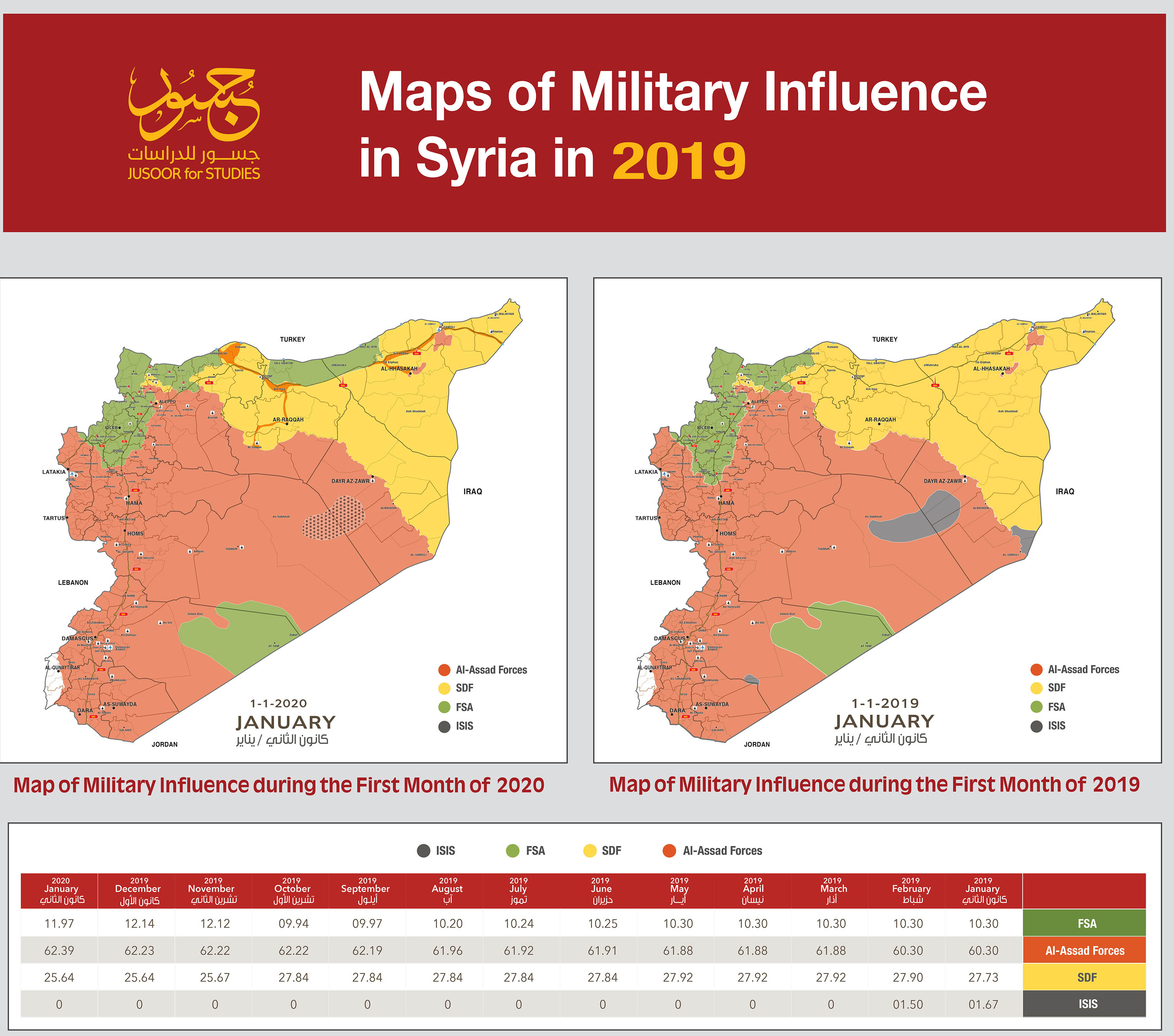 The year 2019 carried major changes for the various actors in the map of control and influence. On the one hand, like 2018, the Syrian regime benefited the most whereas the biggest loser was ISIS. On the other hand, there is a discrepancy in the degree of gain and loss for the Syrian opposition, and the SDF has lost the most compared with the remaining actors.