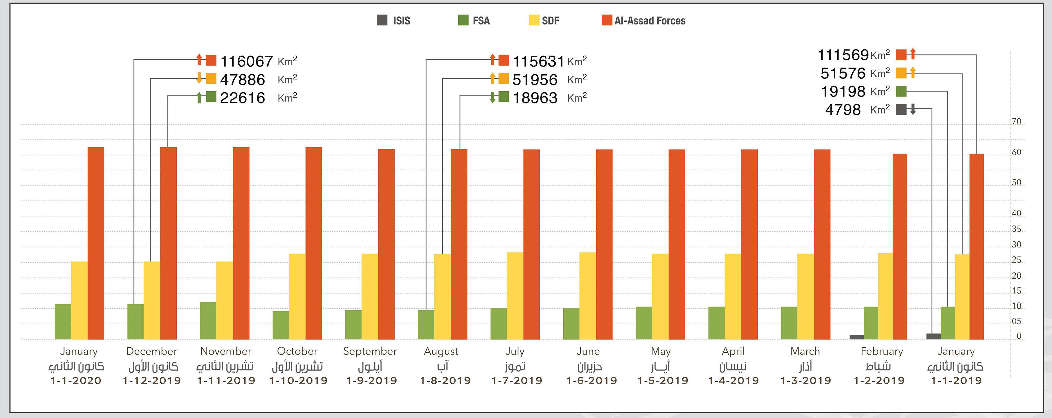 The opposition factions’ area of control expanded in 2019, reaching (12.13%) at the end of December, compared to the estimate ratio of (10.3%) recorded in 2018.