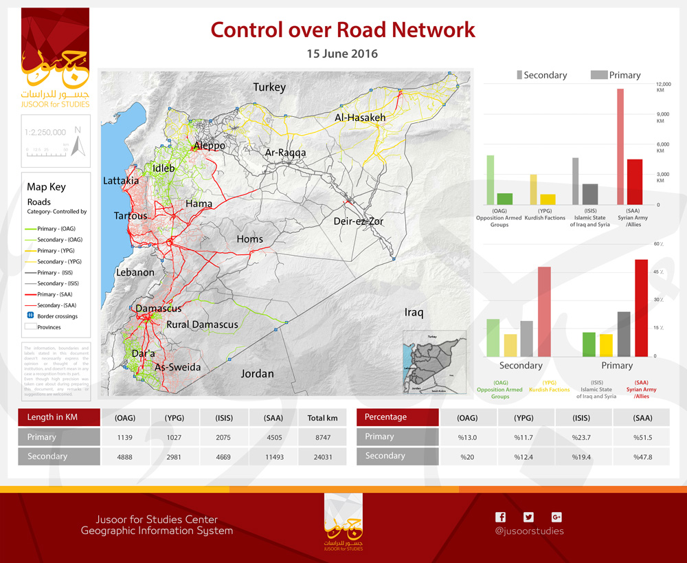 This study shows that the Syrian armed forces controls long parts of the main axis of the roadway network including Damascus-Aleppo autobahn, considering that his control over the majority of the densely populated areas has given him the opportunity to have the biggest ratio (nearly 50%) of control over the roadway network with both main roads and sub-roads.
