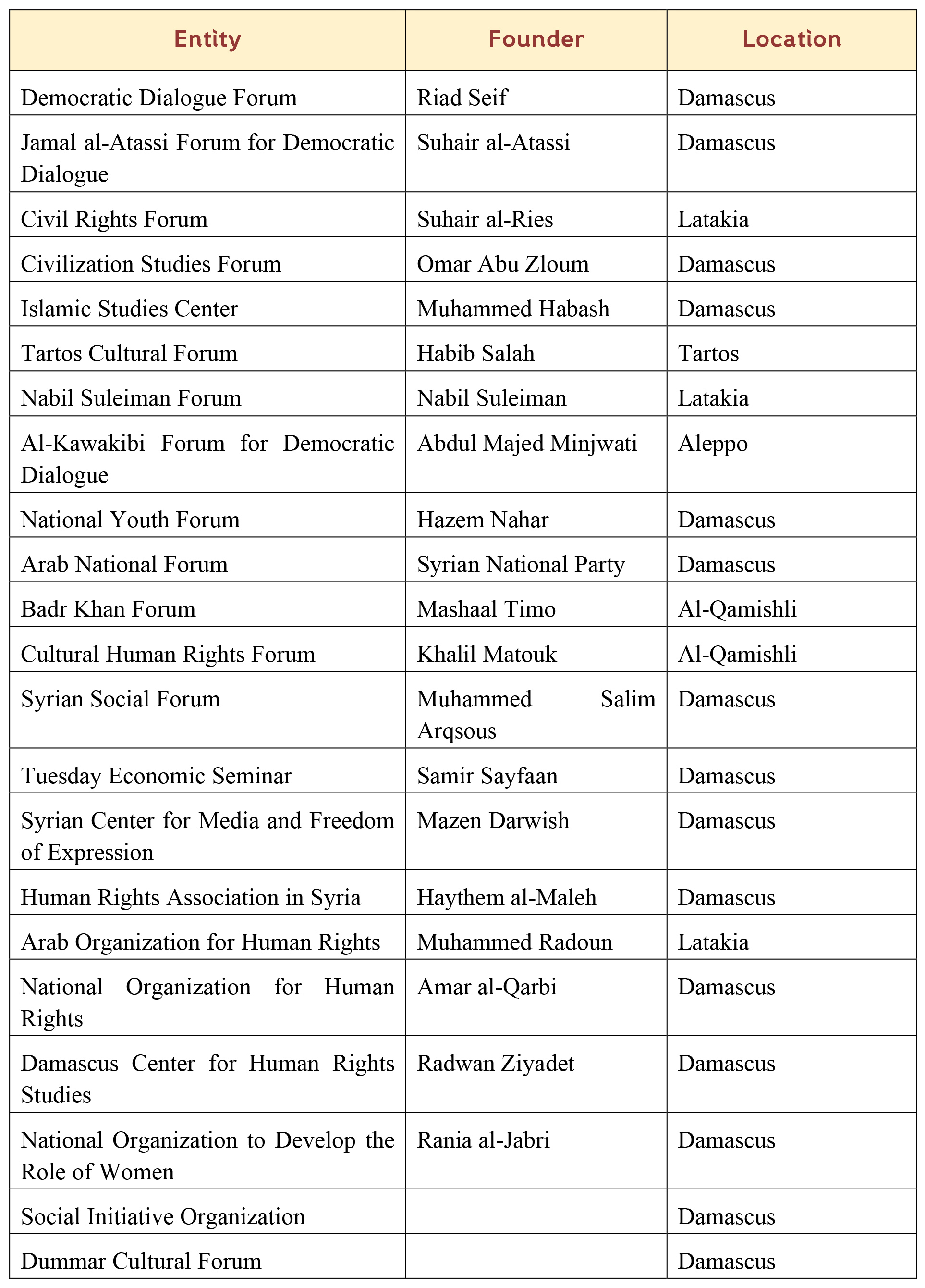 Almost every Syrian province had one or more civil society entities, and most of them did not have a public name due to not having licenses from the Ministry of Social Affairs and Labor(7). The National Dialogue Forum, established by former MP and opposition figure Riad Seif in mid-September 2000, was an exception alongside the Jamal al-Atassi Forum, founded by Suhair al-Atassi, mid-January 2001. The Jamal al-Atassi Forum’s public activities did not last long, and al-Atassi was forced to carry out the forum’s activities and programs in secret due to the many obstacles the forum faced from the regime .