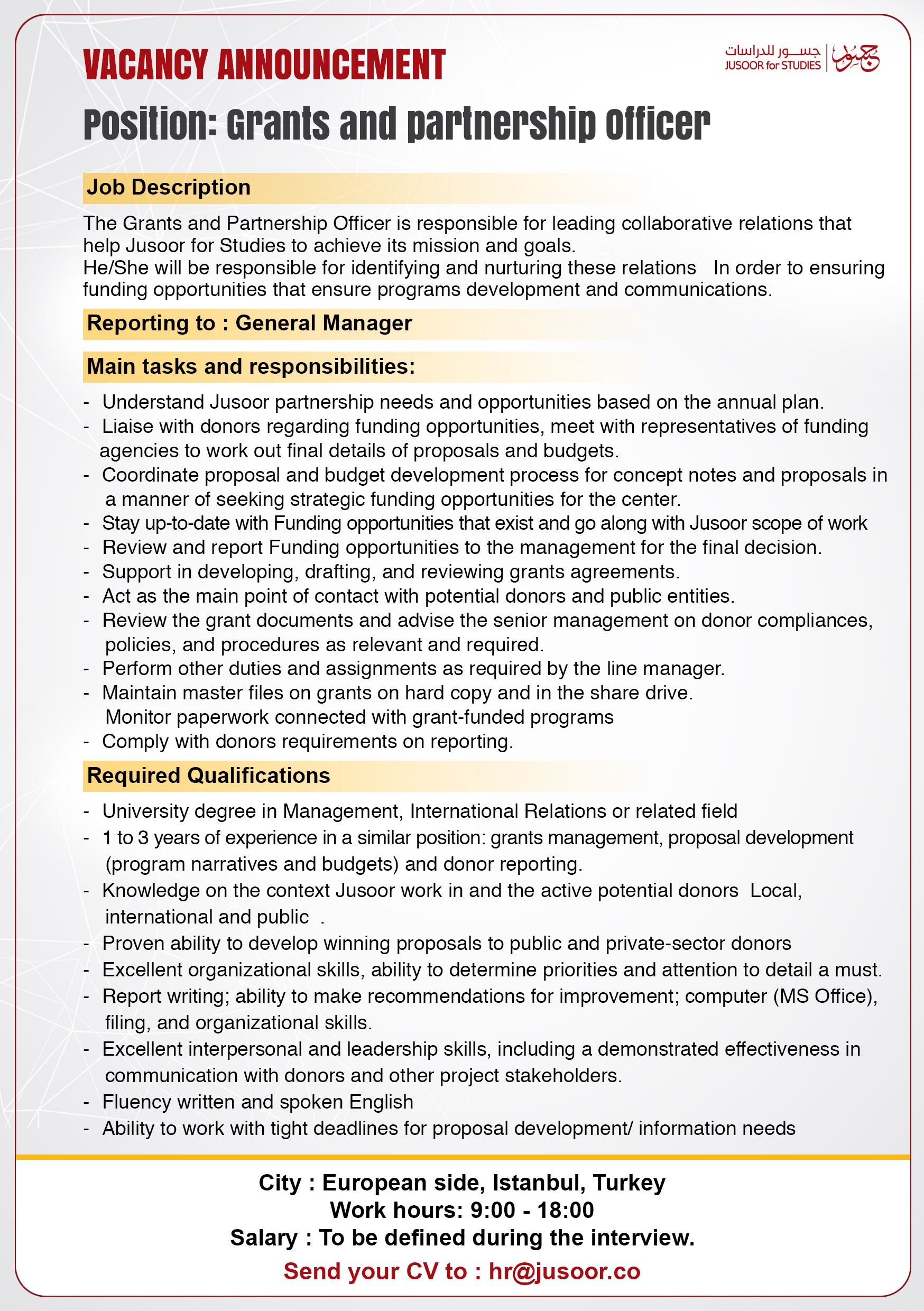 The Grants and Partnership Officer is responsible for leading collaborative relations that help Jusoor for Studies to achieve its mission and goals. He/She will be responsible for identifying and nurturing these relations In order to ensuring funding opportunities that ensure programs development and communications.