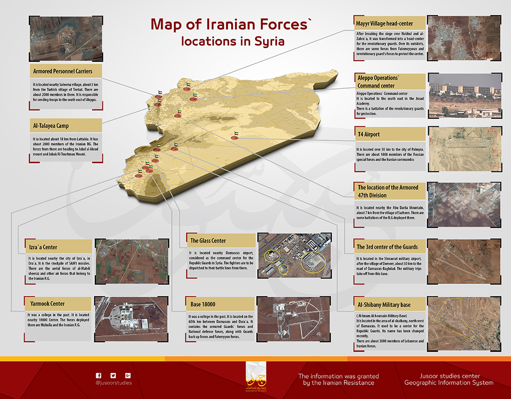 In a documentation of its own kind, the IRANIAN RESISTANCE has specified the location of IRANIAN forces in different SYRIAN's Governorates, which has been represented in this visual infograph by JUSOOR fo STUDIES to reach a bigger spectrum of people.