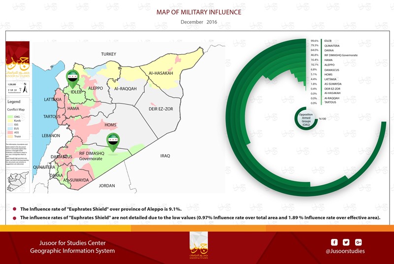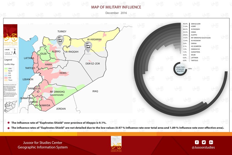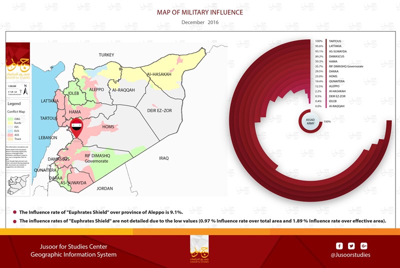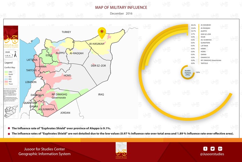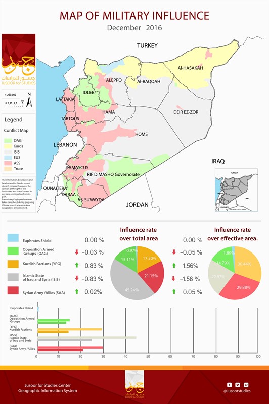 Jusoor for Studies issued the military influence map for December 2016, which showed that the ratio of total and effective controlling of areas by various fighting parties were different from the ratio in the map of November 2016.