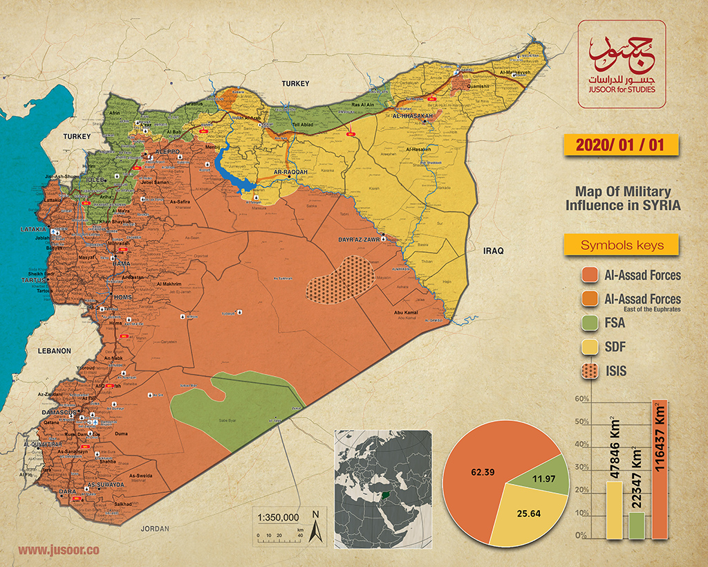 According to Jusoor for Studies released map, the ratios of the different forces’ control on the ground have become as follows: