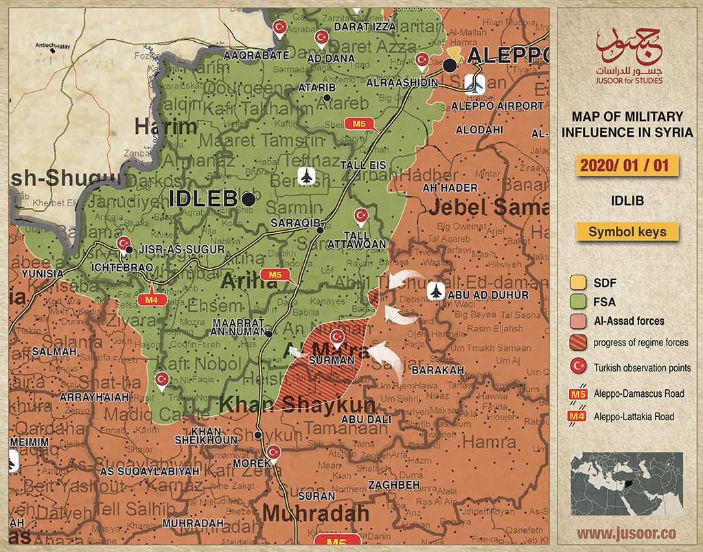 During December 2019, the Syrian regime forces made significant progress in the de-escalation zone after resuming hostilities in November 2019, southeast of Idlib. This has led to a clear change in the map of influence within the buffer zone, where the Turkish control point in Tal al-Surman became completely surrounded with the the Syrian regime forces approaching the strategic city of Maaret al-Numan.